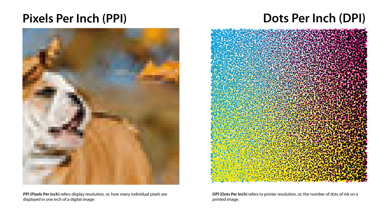 Printed image resolution is represented as dots per inch (DPI), which refers to the literal printed dots of ink per inch. While PPI and DPI are technically different, they are often used interchangeably and the conversion is generally taken as 1 PPI : 1 DPI. We will use PPI and DPI interchangeably.