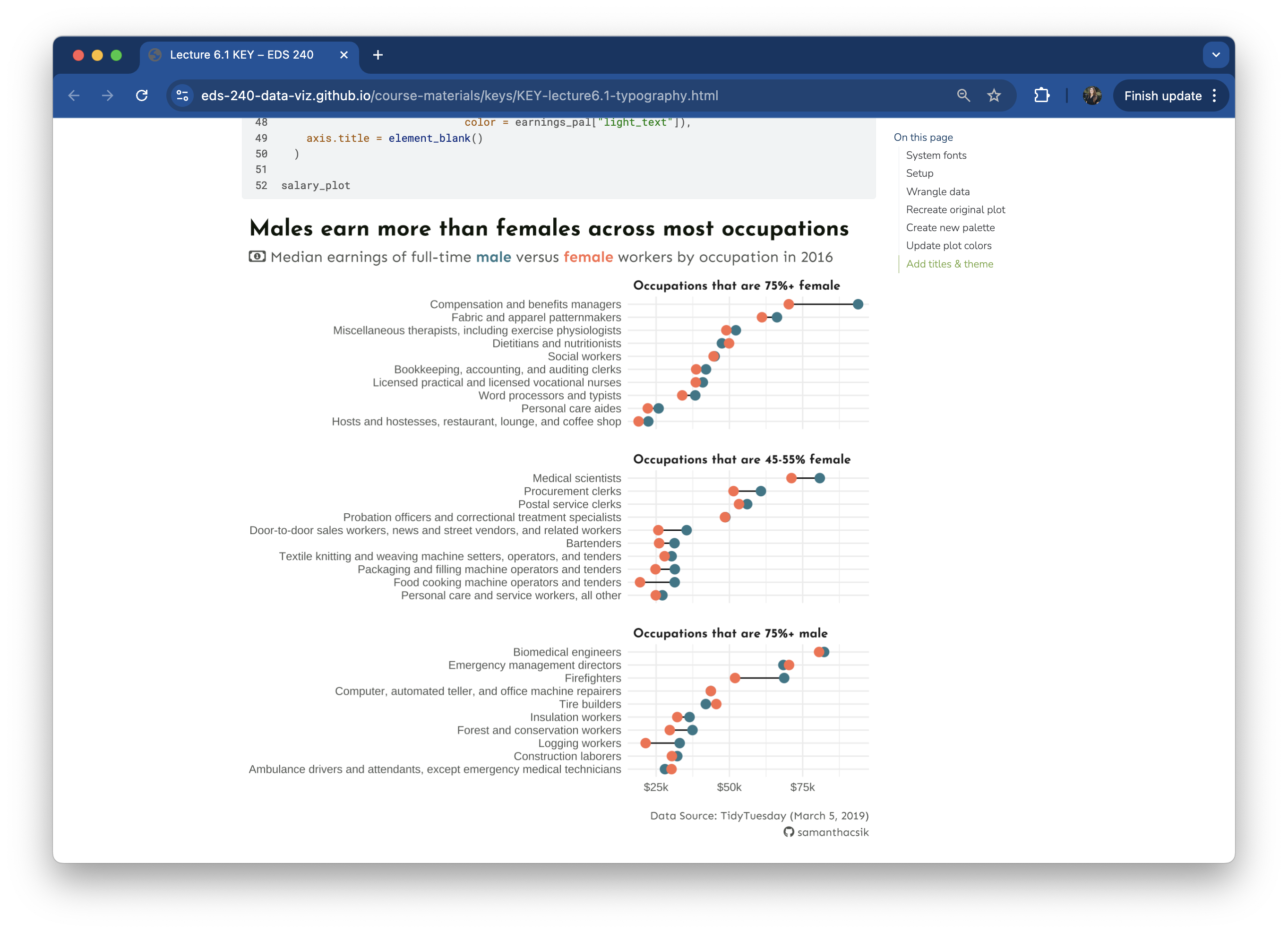 We iterated on our salary plot by updating colors, theme elements, and most notably, our fonts. It rendered nicely in our Quarto doc, with the help of a couple code chunk options to set the size (out-width: "100%") and aspect ratio (fig-asp: 1):