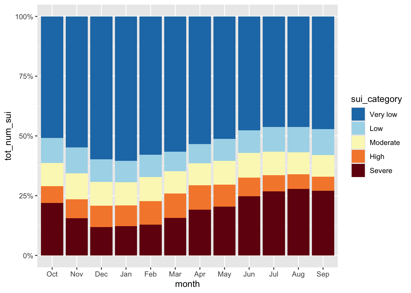 ggplot(sui_severity, aes(x = month, y = tot_num_sui, fill = sui_category)) +