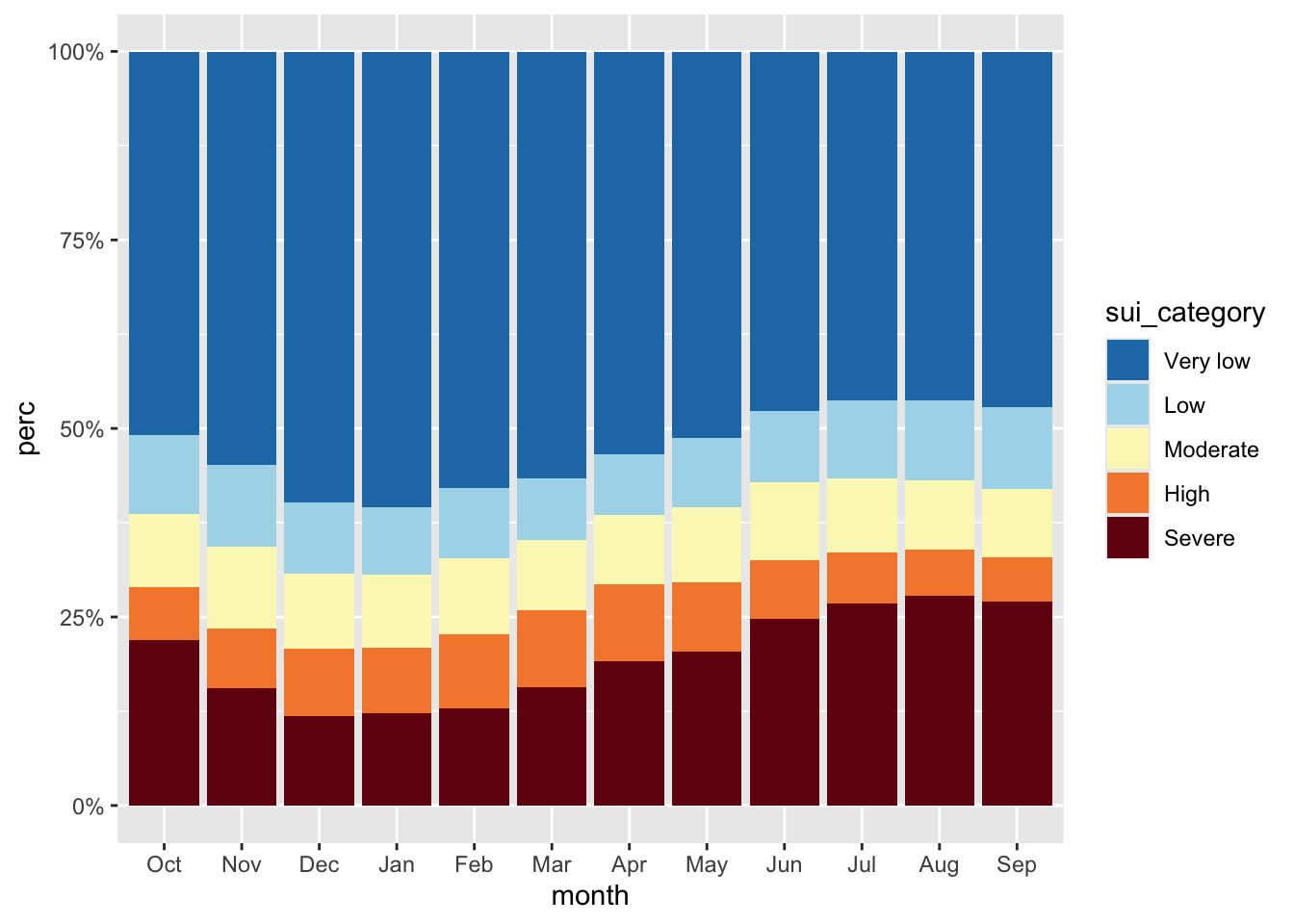ggplot(sui_severity, aes(x = month, y = perc, fill = sui_category)) +