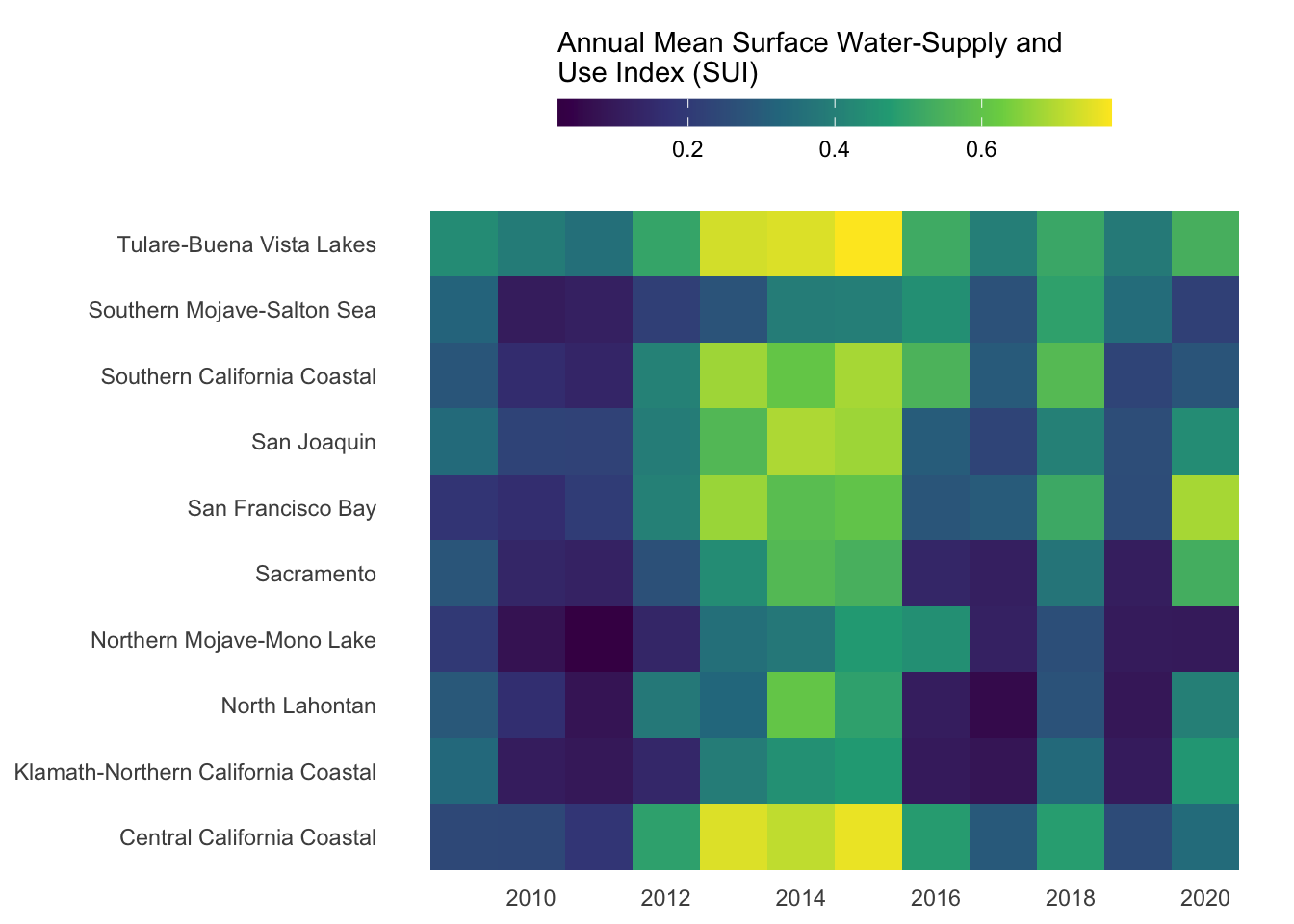 Our goal: create a heatmap that shows how water stress (represented by SUI) changes through time for each of the ten HUC 18 subregions