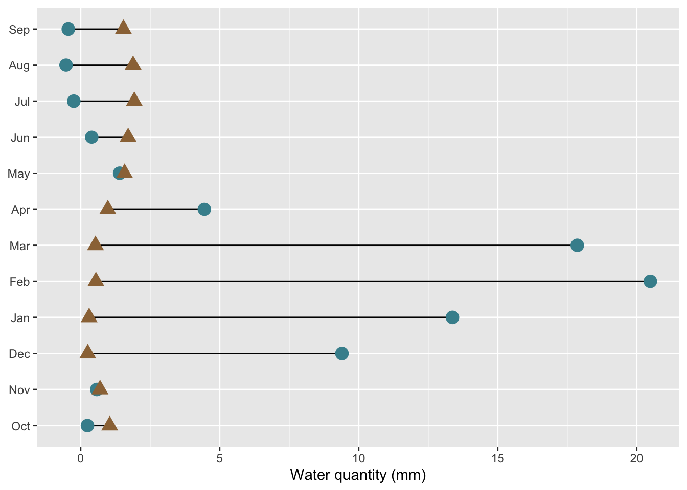 month = factor(month, levels = c(month.abb[10:12], month.abb[1:9])))Then, create dumbbell plot: