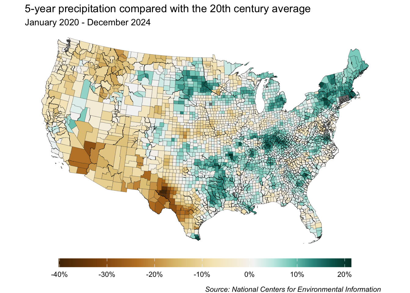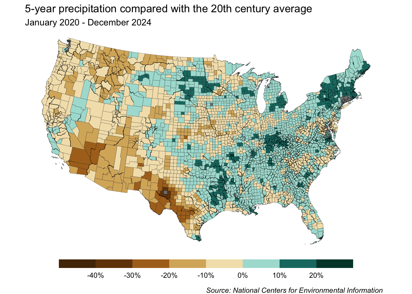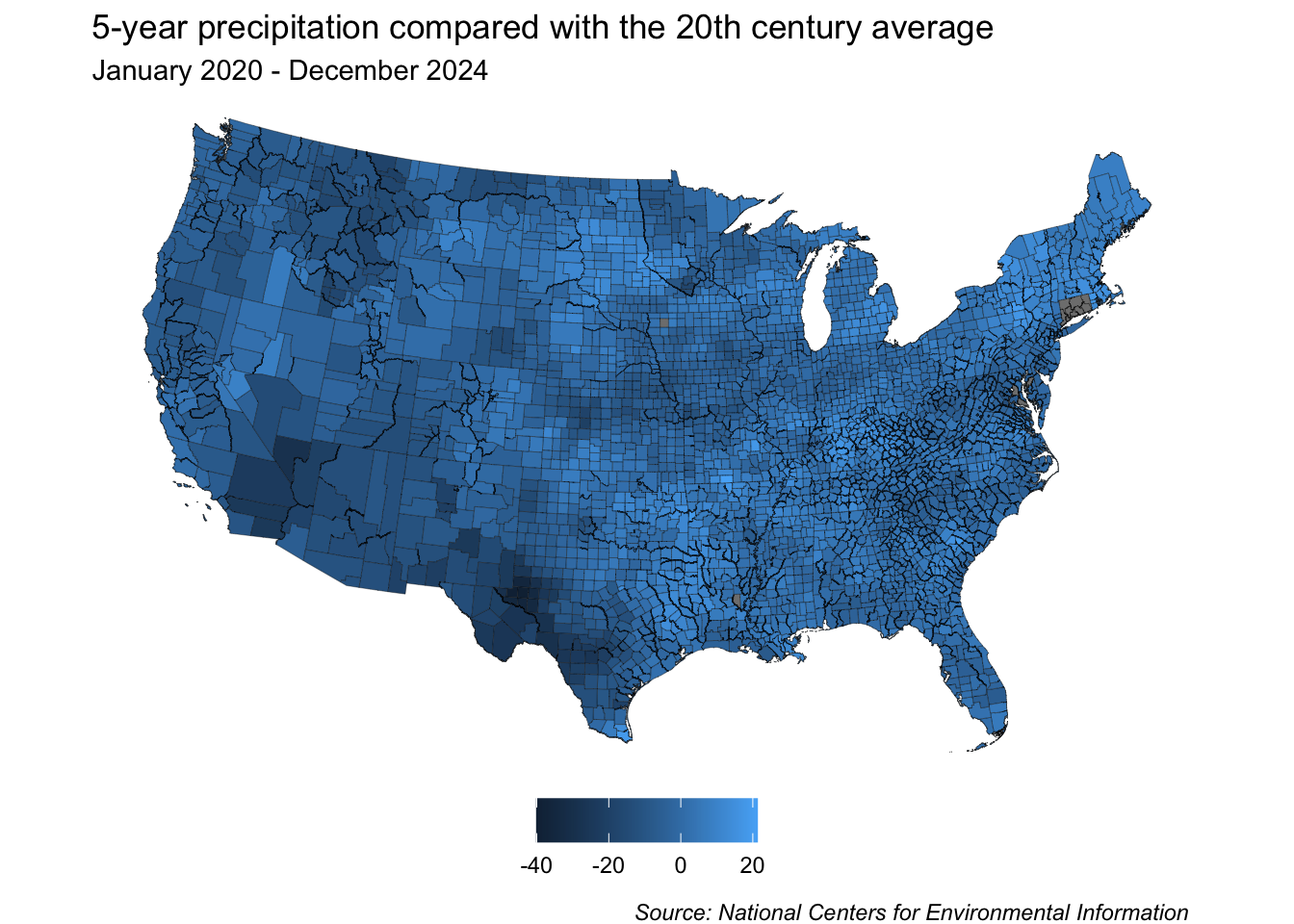 labs(title = "5-year precipitation compared with the 20th century average",