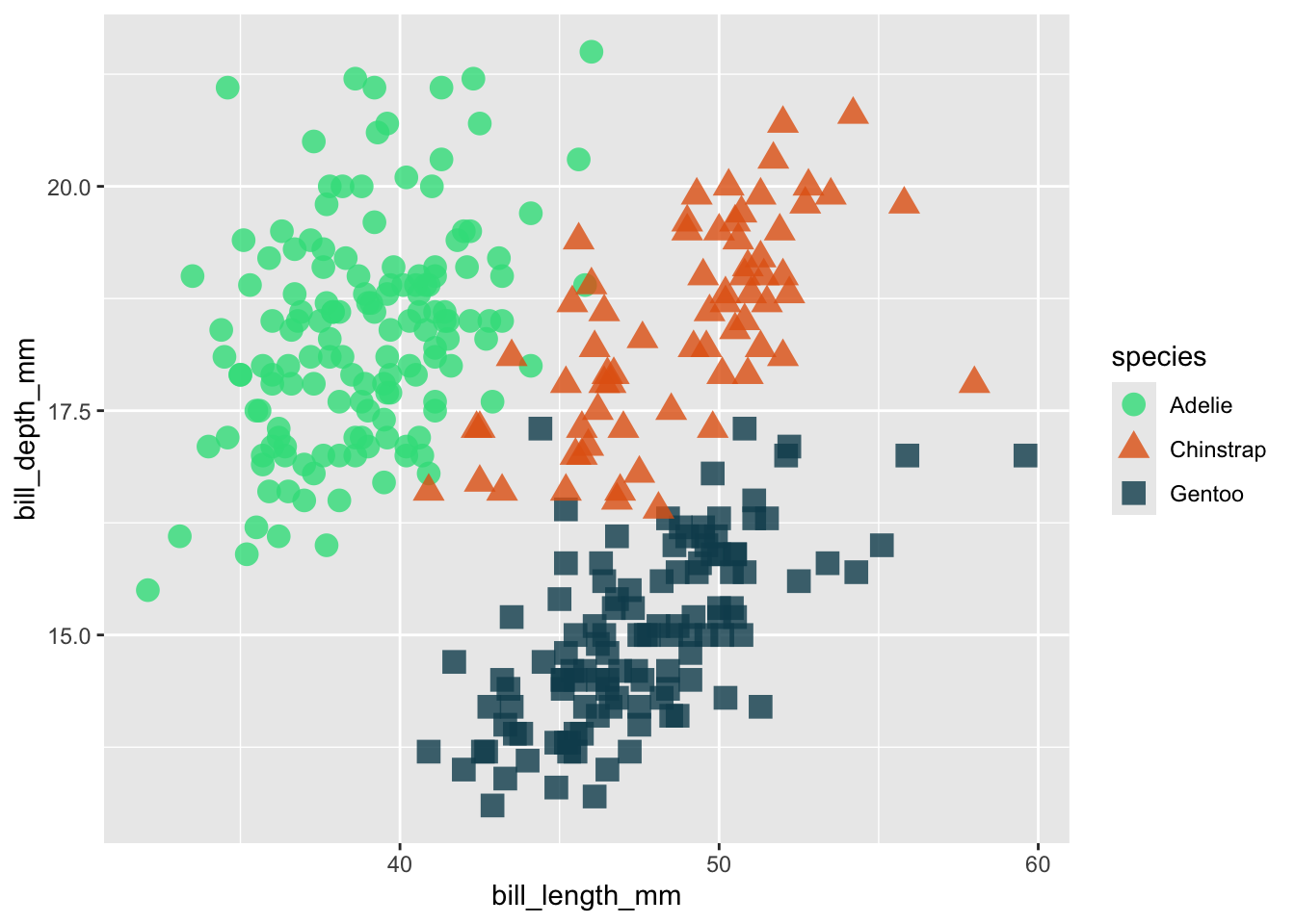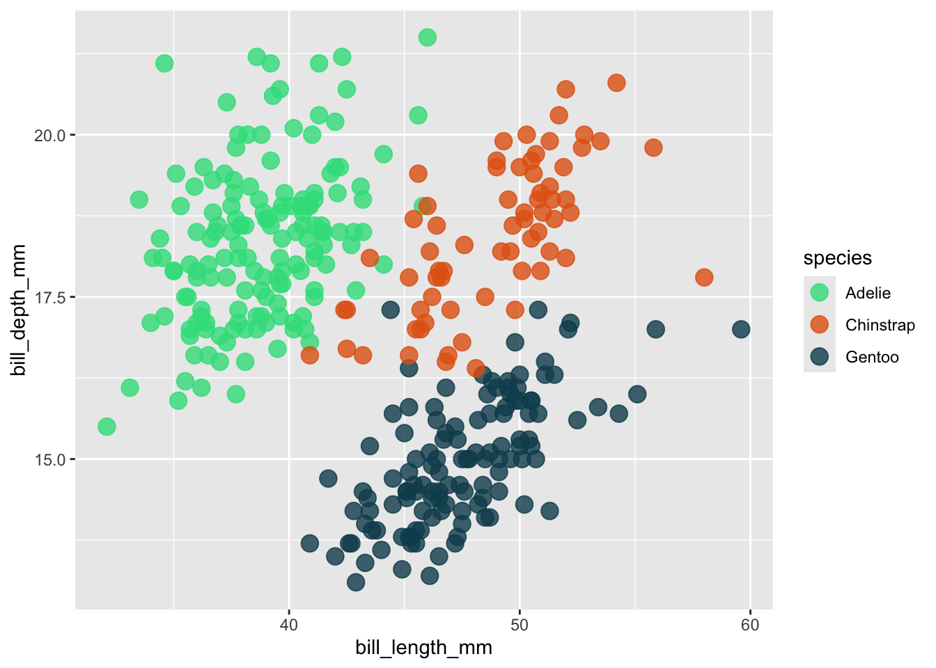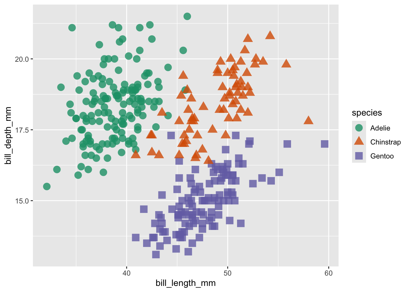 ggplot (penguins, aes (x = bill_length_mm, y = bill_depth_mm, color = species)) +