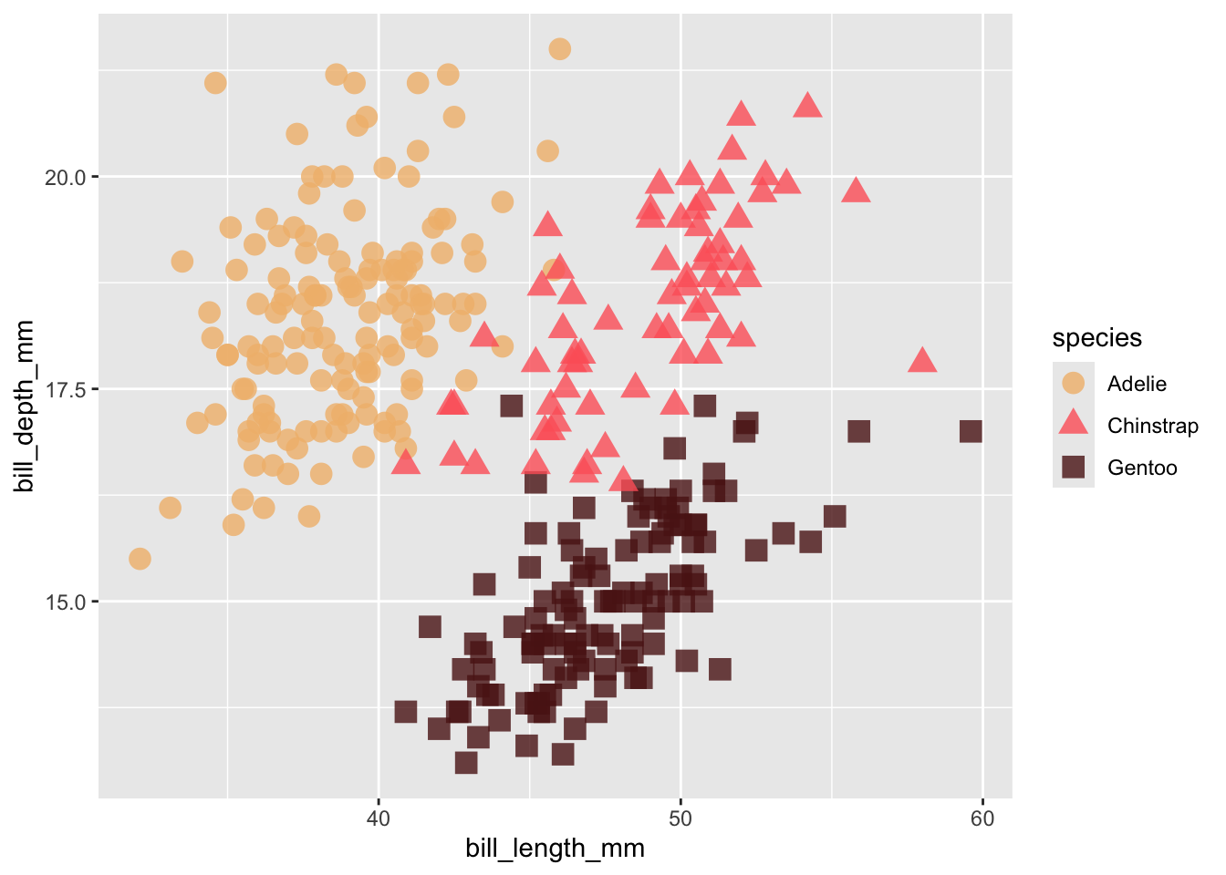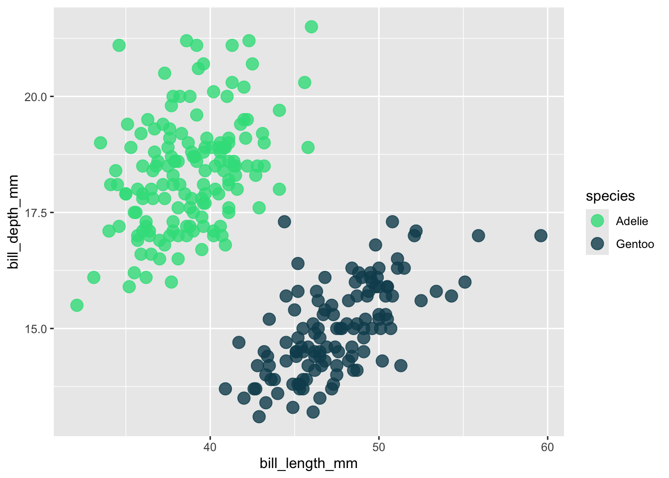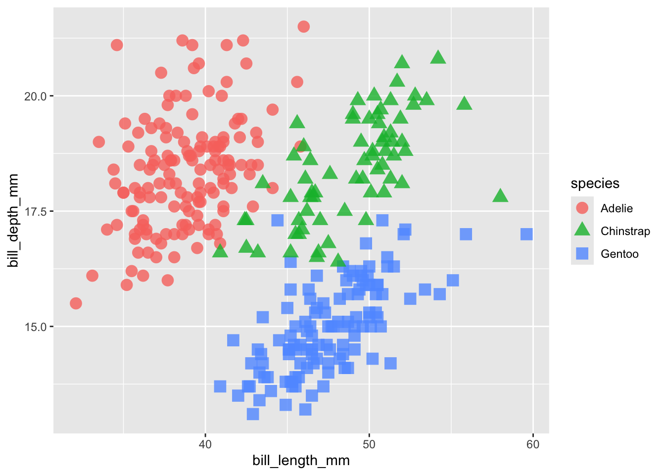 ggplot (penguins, aes (x = bill_length_mm, y = bill_depth_mm, color = species)) +