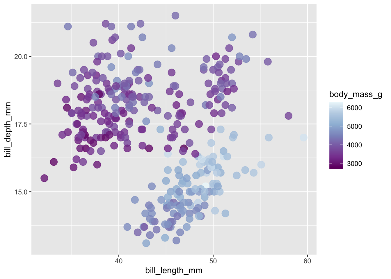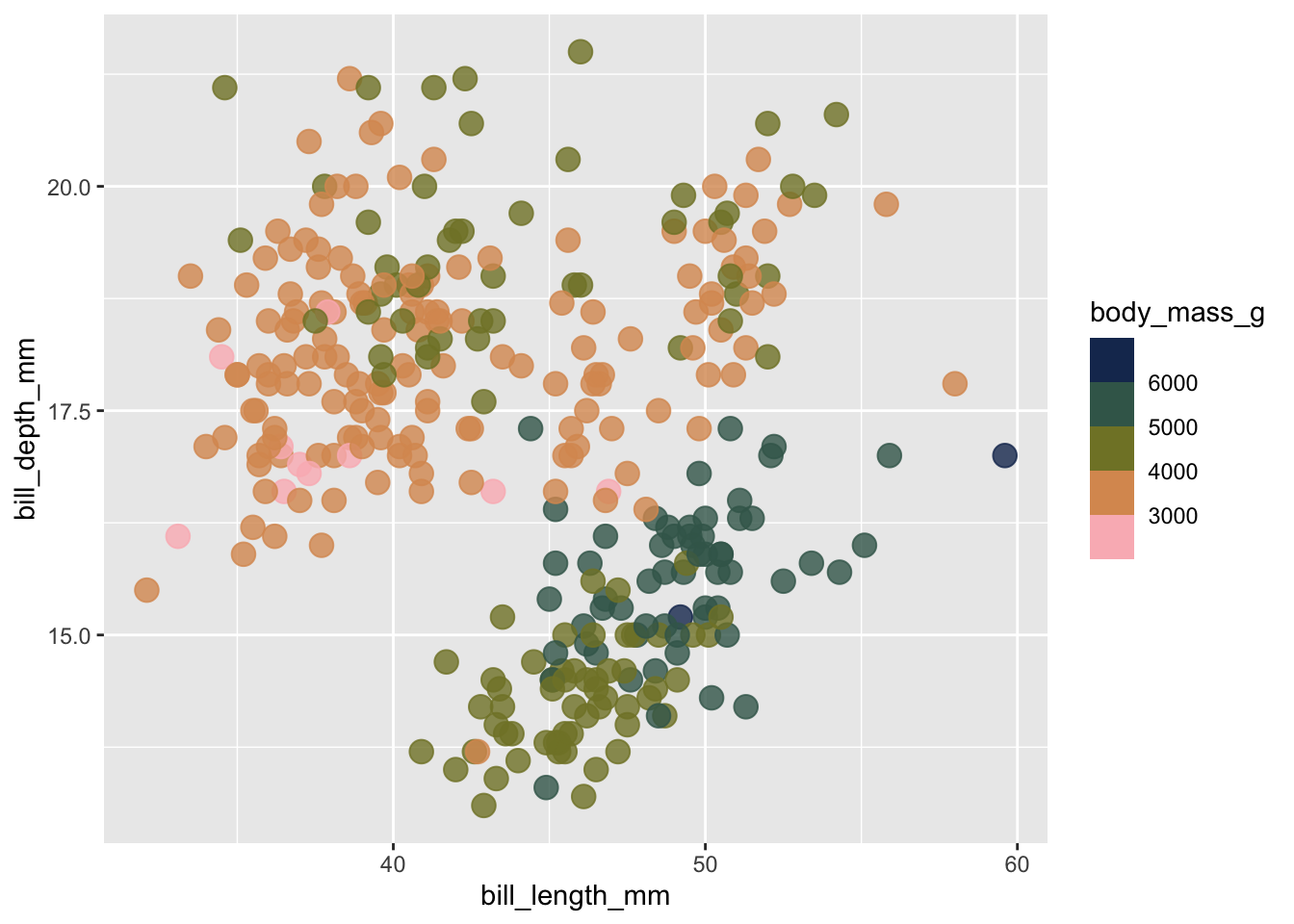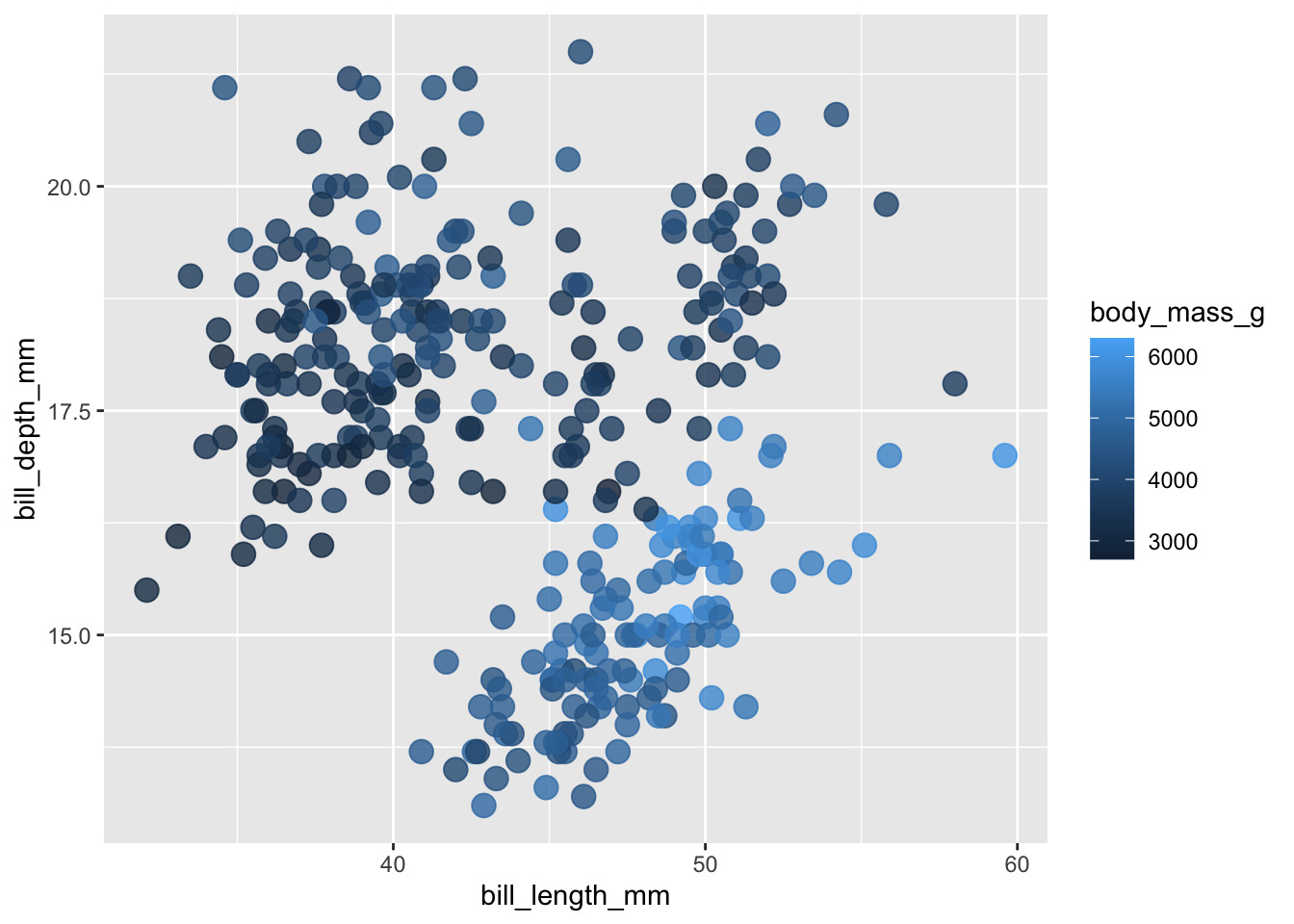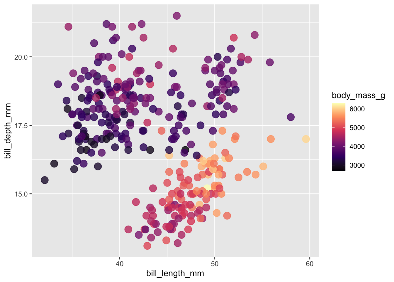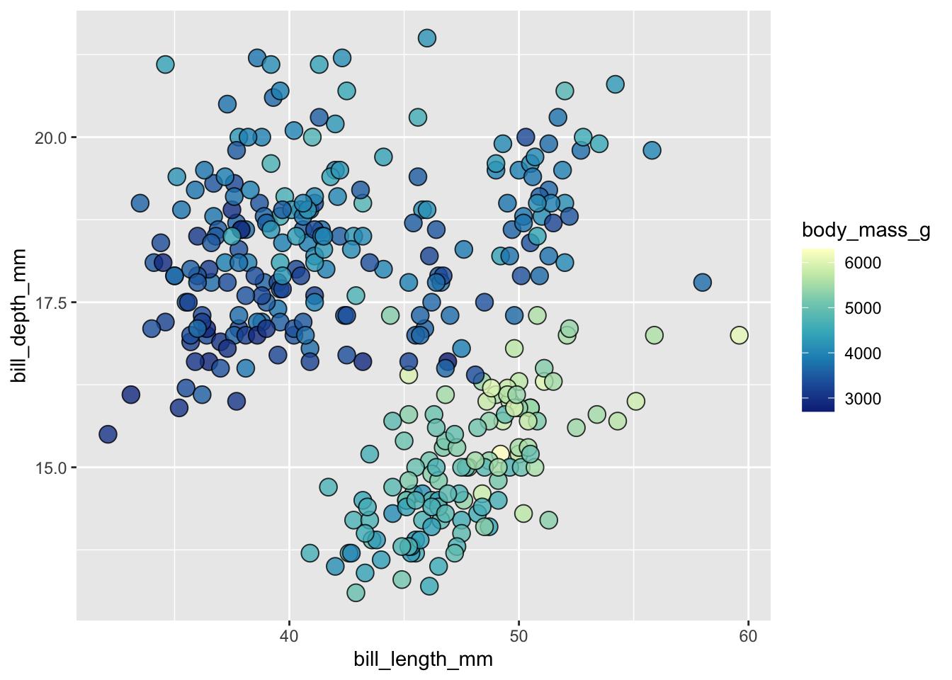 ggplot (penguins, aes (x = bill_length_mm, y = bill_depth_mm, fill = body_mass_g)) + # notice switch from `color` > `fill`