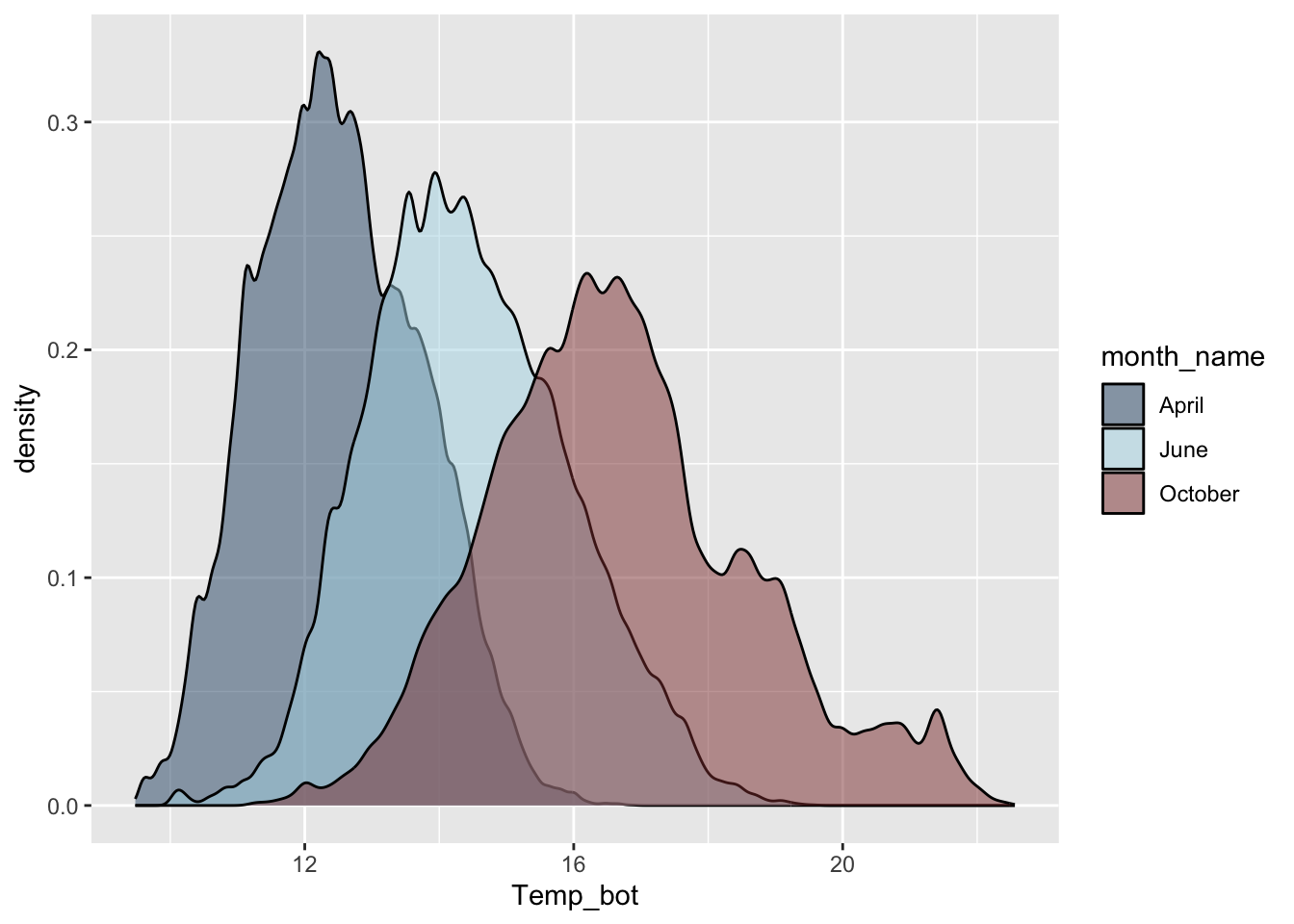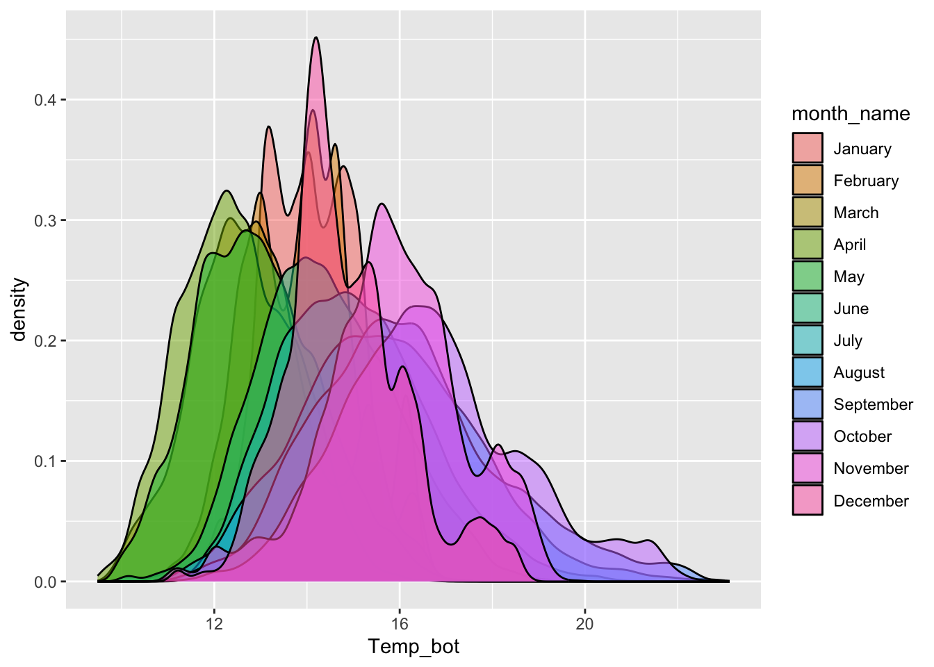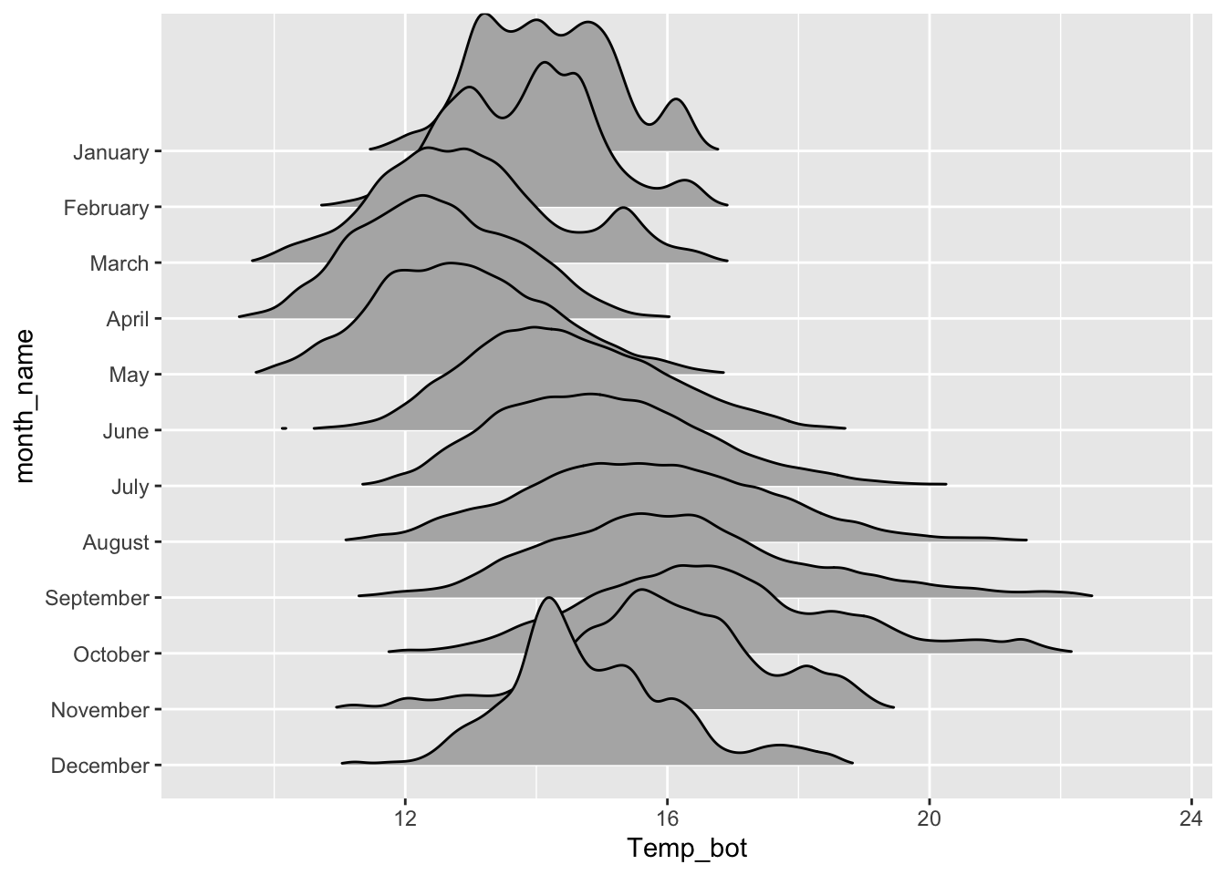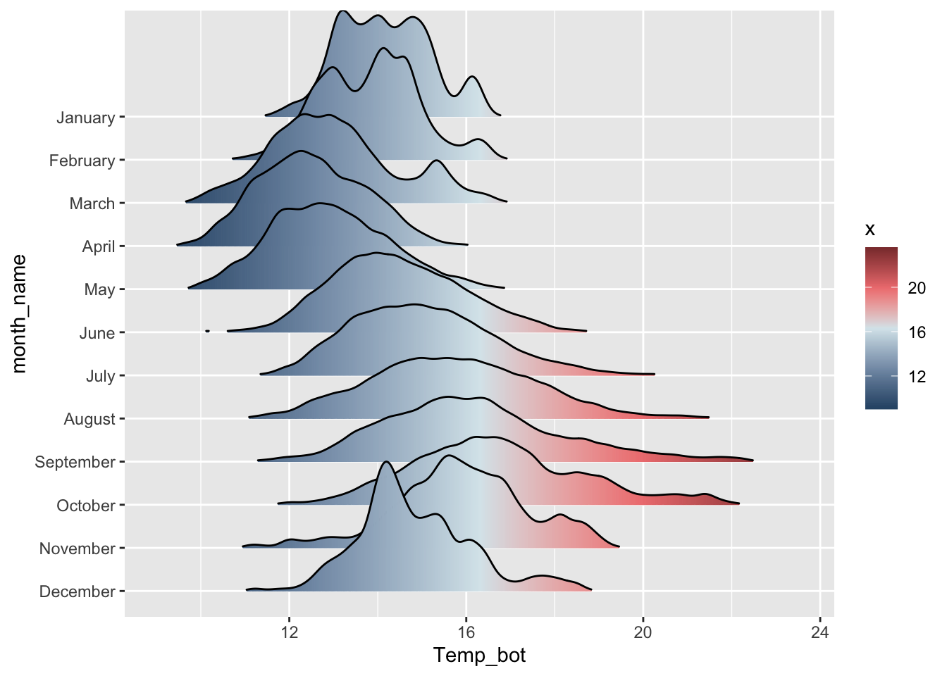 ggplot(aes(x = Temp_bot, y = month_name, fill = after_stat(x))) + # `fill = after_stat(x)` tells ggplot to compute the `x` values (representing `Temp_bot`) after the statistical transformation (density estimation) and map those computed `x` values to the `fill` aesthetic. As a result, the gradient fill of each density curve will reflect the temperature values along the x-axis.