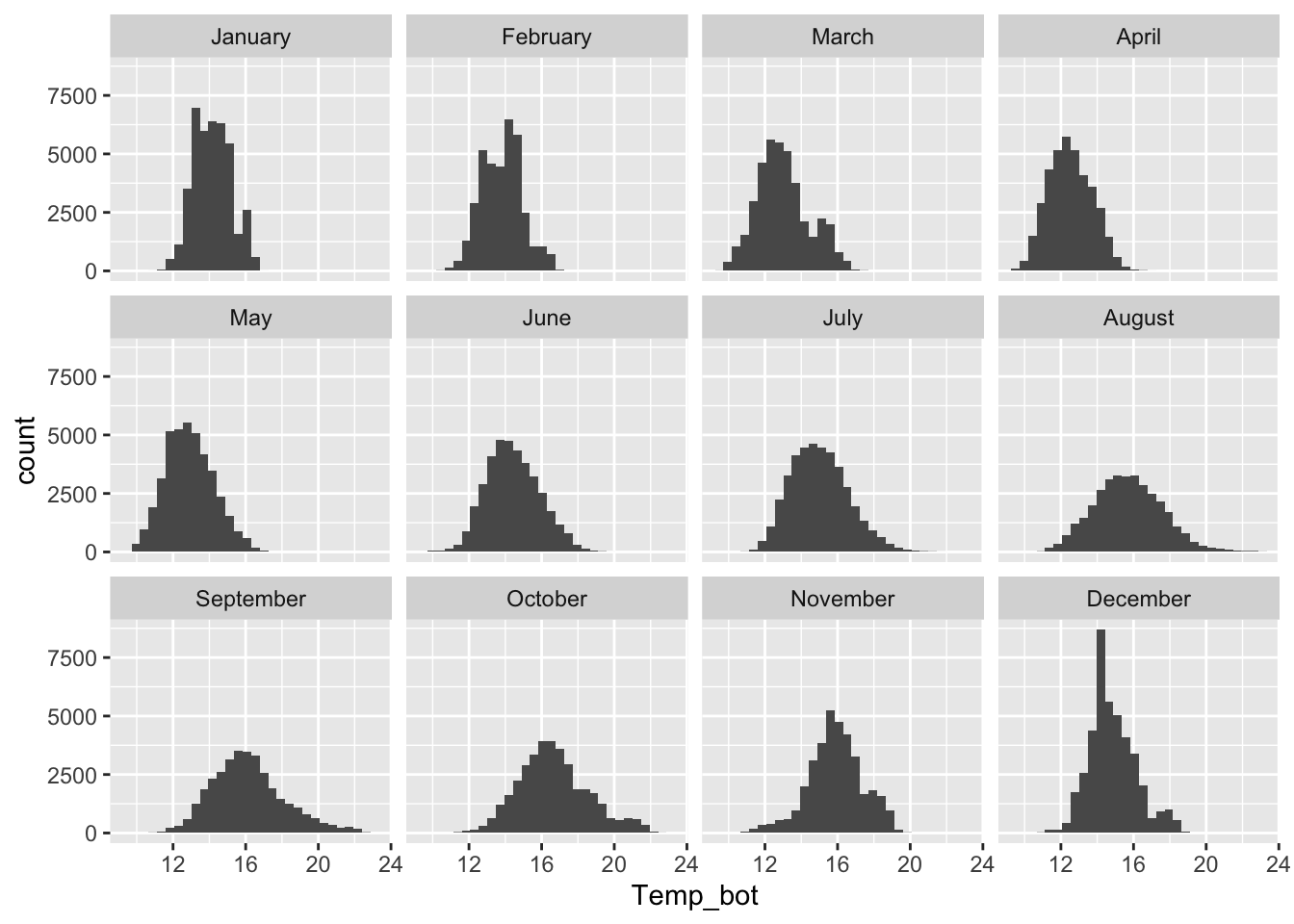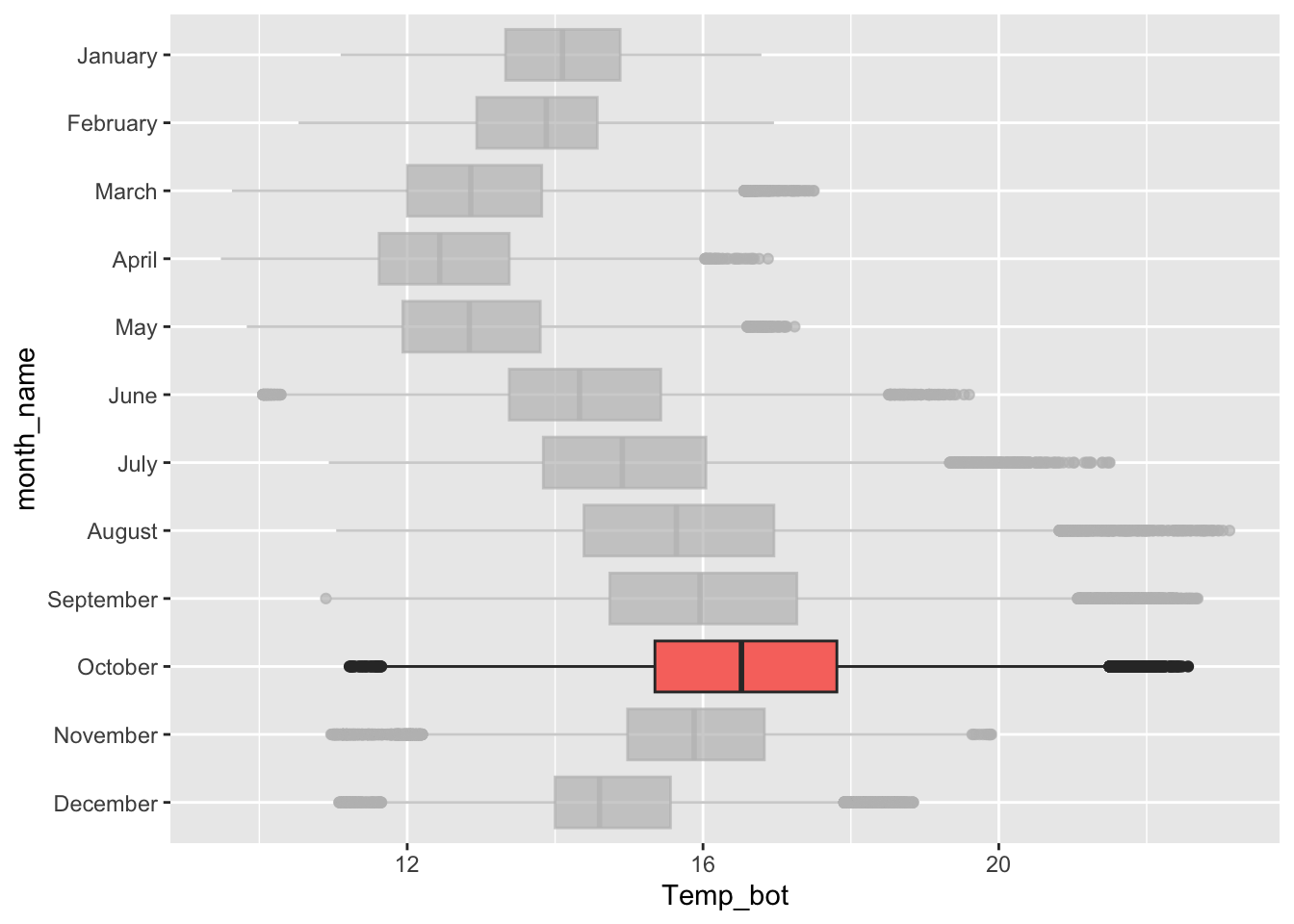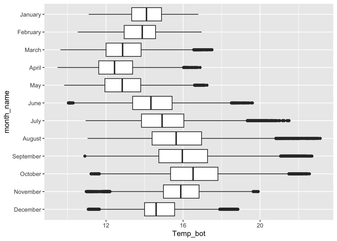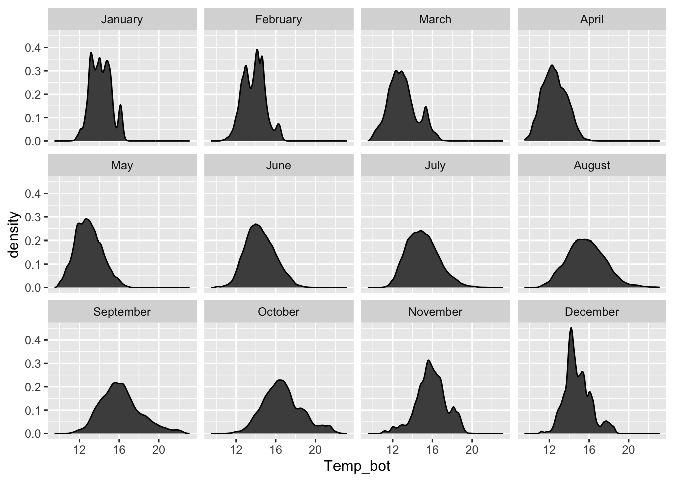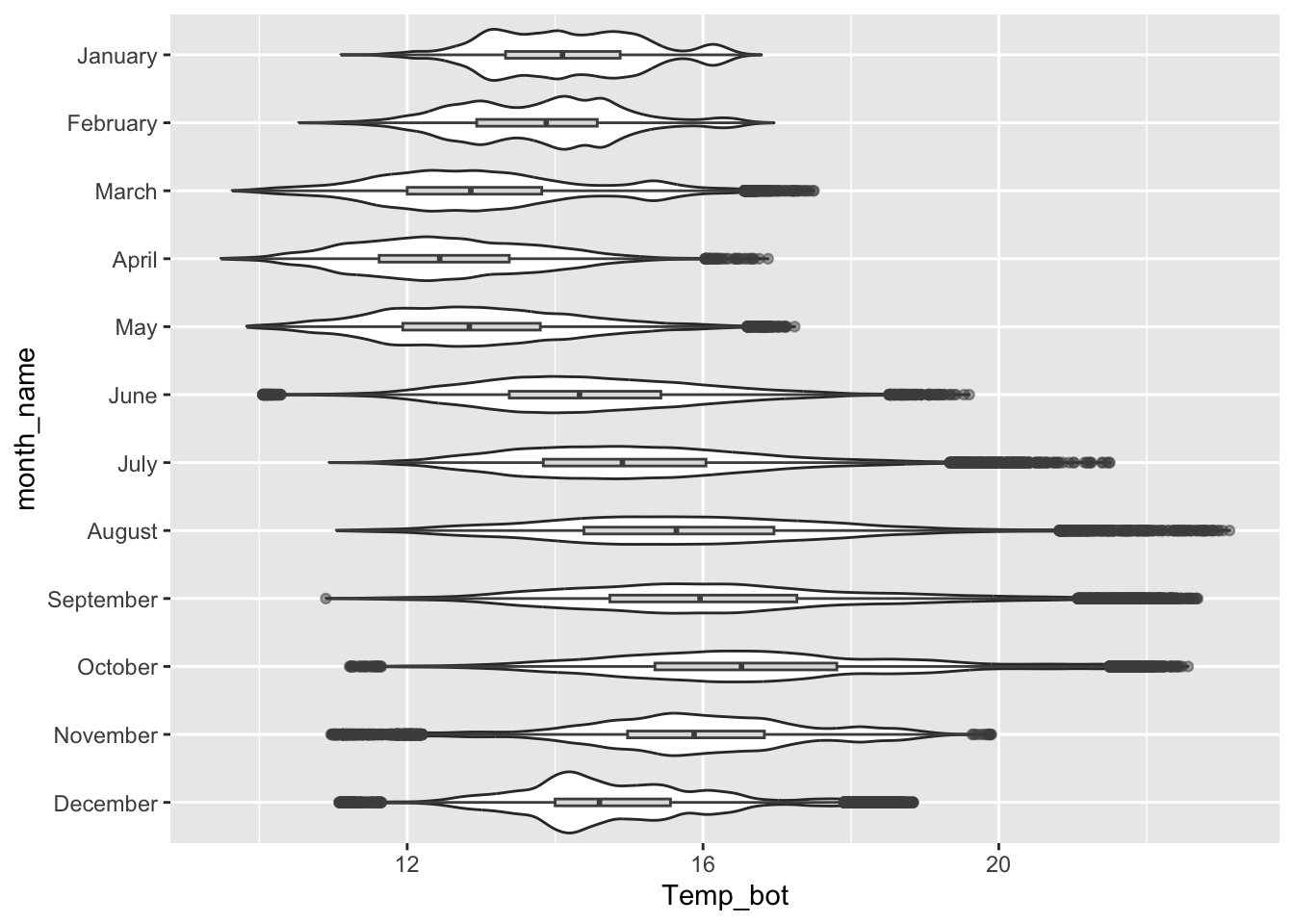 ggplot(aes(x = Temp_bot, y = month_name, fill = after_stat(x))) + # `fill = after_stat(x)` tells ggplot to compute the `x` values (representing `Temp_bot`) after the statistical transformation (density estimation) and map those computed `x` values to the `fill` aesthetic. As a result, the gradient fill of each density curve will reflect the temperature values along the x-axis.