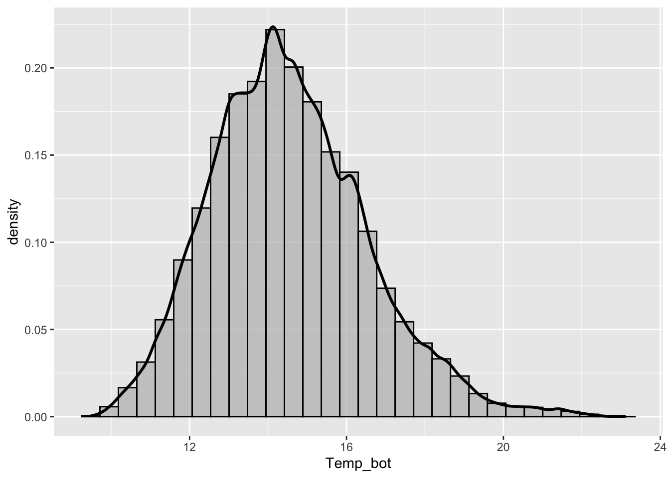 - consider your scale of interest e.g. does a bin width of 1 (°C) make sense for our histogram? Does your density plot’s bandwidth show the true underlying data distribution shape while reducing noise?