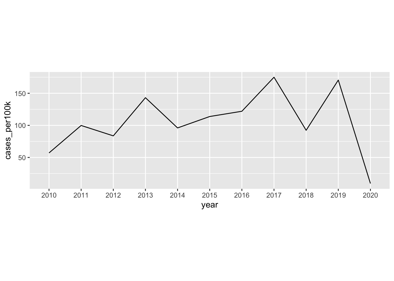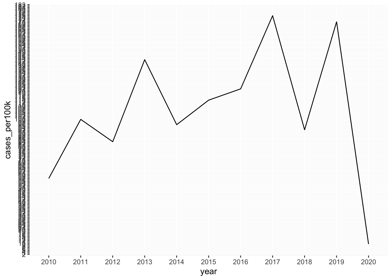 - here, 10 units on our x-axis (years 2010 - 2020), and ~175 units (case_per100k 0 to ~175) on our y-axis