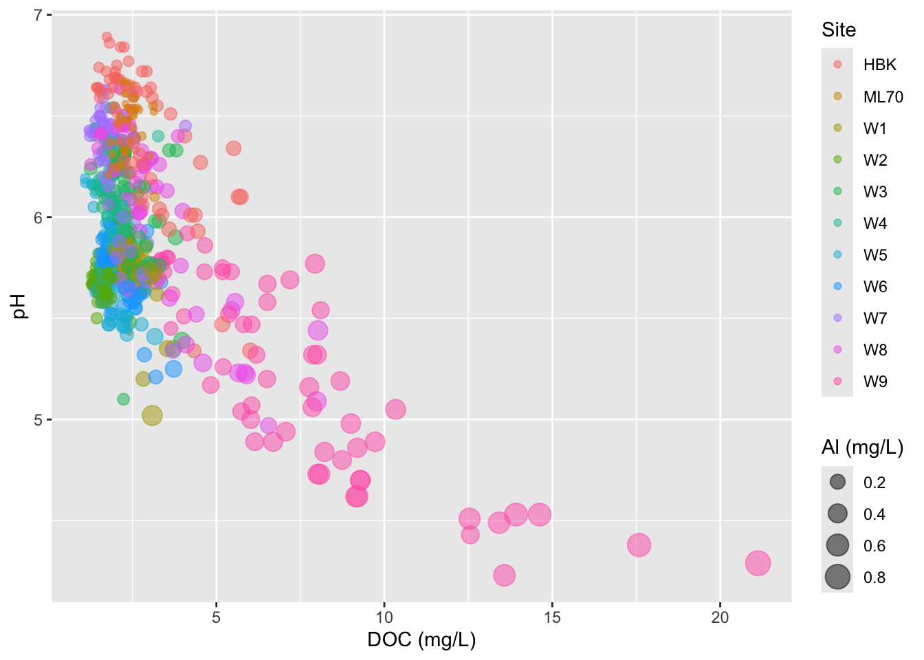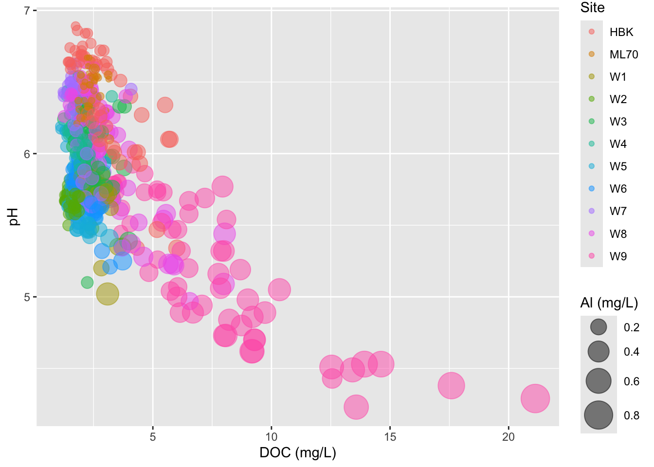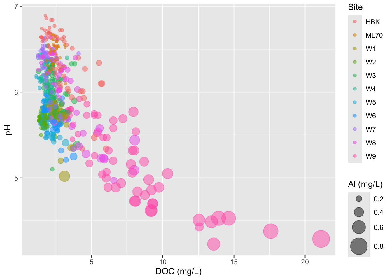 labs(x = "DOC (mg/L)", size = "Al (mg/L)", color = "Site")