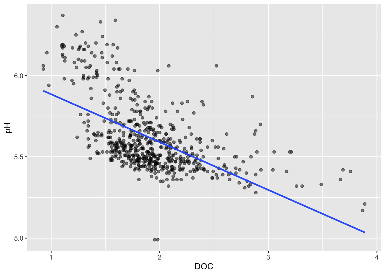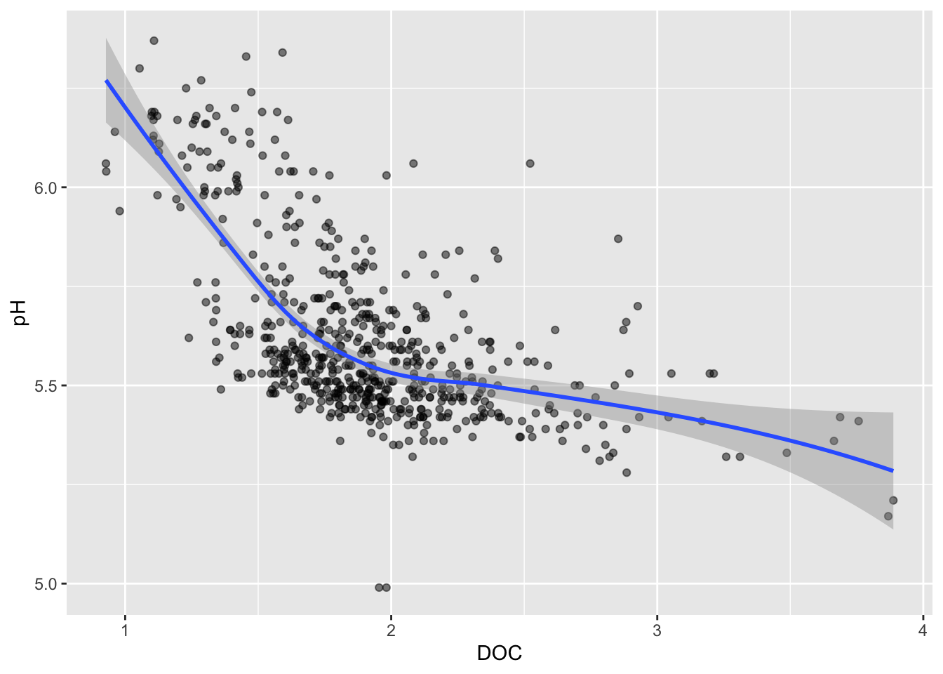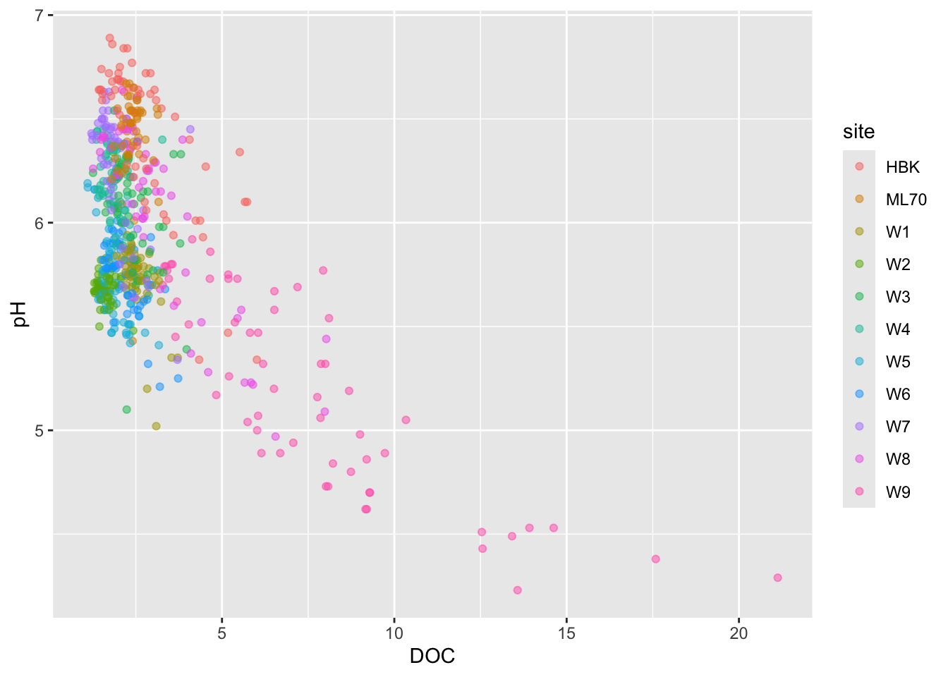 ggplot(aes(x = DOC, y = pH, color = site)) +