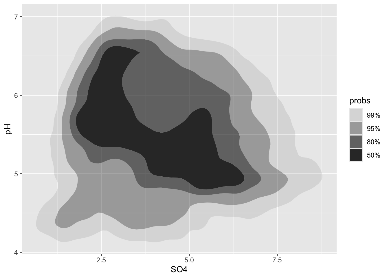 - legend provides an estimate of the proportion of data points fall within a colored region (density of distribution of points sums to 1)