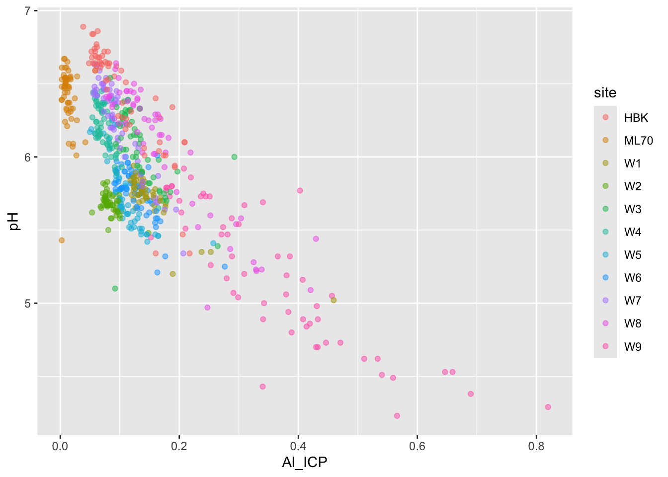 ggplot(aes(x = Al_ICP, y = pH, color = site)) +