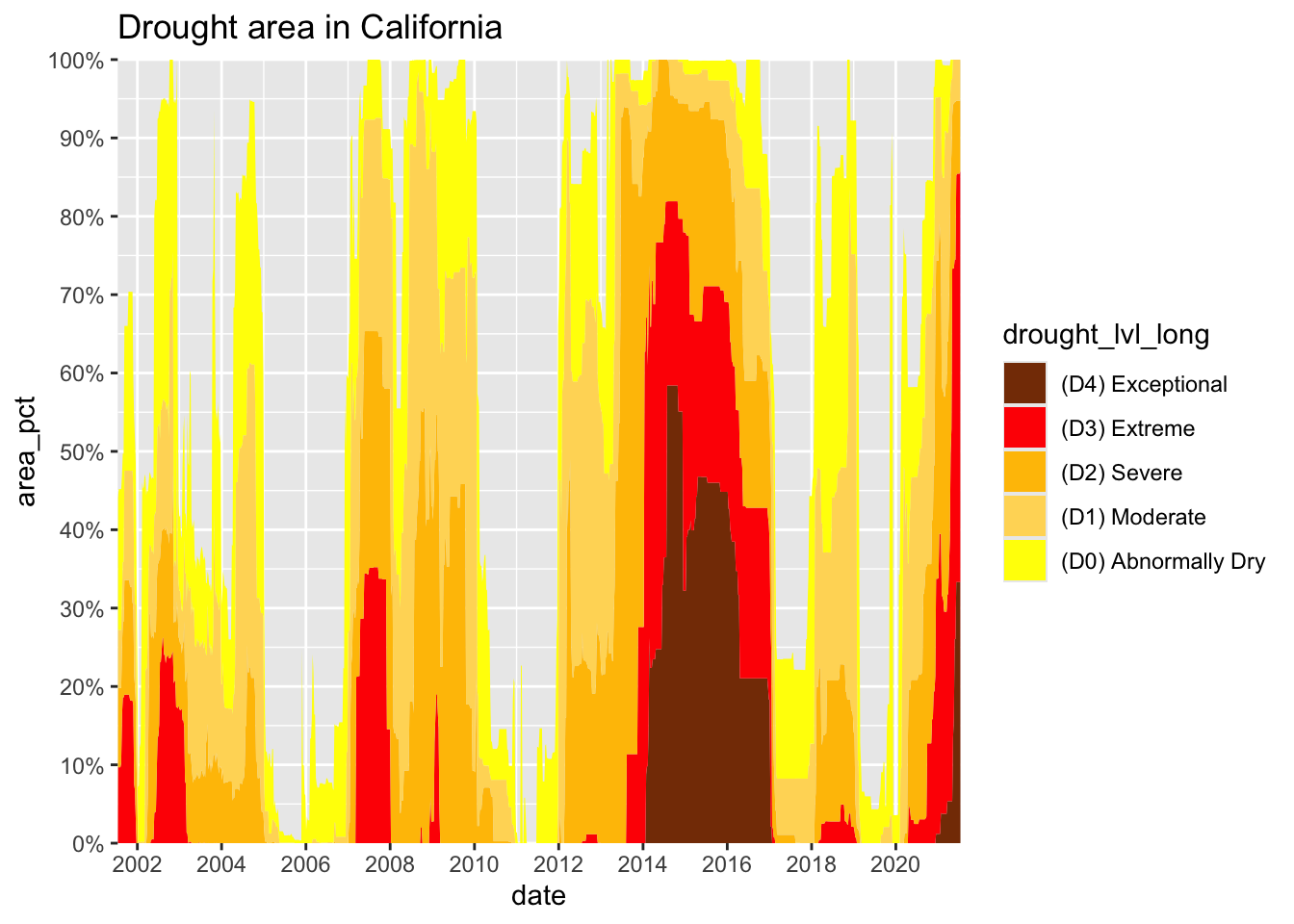 ##~~~~~~~~~~~~~~~~~~~~~~~~~~~~~~~~~~~~~~~~~~~~~~~~~~~~~~~~~~~~~~~~~~~~~~~~~~~~~~## setup ----##~~~~~~~~~~~~~~~~~~~~~~~~~~~~~~~~~~~~~~~~~~~~~~~~~~~~~~~~~~~~~~~~~~~~~~~~~~~~~~#..........................load packages.........................library(tidyverse)#..........................import data...........................drought <- readr::read_csv('https://raw.githubusercontent.com/rfordatascience/tidytuesday/main/data/2021/2021-07-20/drought.csv')##~~~~~~~~~~~~~~~~~~~~~~~~~~~~~~~~~~~~~~~~~~~~~~~~~~~~~~~~~~~~~~~~~~~~~~~~~~~~~~## wrangle drought data ----##~~~~~~~~~~~~~~~~~~~~~~~~~~~~~~~~~~~~~~~~~~~~~~~~~~~~~~~~~~~~~~~~~~~~~~~~~~~~~~drought_clean <- drought |># select cols of interest & update names for clarity (as needed) ----select(date = valid_start, state_abb, drought_lvl, area_pct) |># add year, month & day cols using {lubridate} fxns ----# NOTE: this step isn't necessary for our plot, but I'm including as examples of how to extract different date elements from a object of class Date using {lubridate} ----mutate(year =year(date),month =month(date, label =TRUE, abbr =TRUE),day =day(date)) |># add drought level conditions names ----mutate(drought_lvl_long =factor(drought_lvl,levels =c("D4", "D3", "D2", "D1","D0", "None"),labels =c("(D4) Exceptional", "(D3) Extreme","(D2) Severe", "(D1) Moderate", "(D0) Abnormally Dry", "No Drought"))) |># reorder cols ----relocate(date, year, month, day, state_abb, drought_lvl, drought_lvl_long, area_pct)##~~~~~~~~~~~~~~~~~~~~~~~~~~~~~~~~~~~~~~~~~~~~~~~~~~~~~~~~~~~~~~~~~~~~~~~~~~~~~~## create stacked area plot of CA drought conditions through time ----##~~~~~~~~~~~~~~~~~~~~~~~~~~~~~~~~~~~~~~~~~~~~~~~~~~~~~~~~~~~~~~~~~~~~~~~~~~~~~~drought_clean |># remove drought_lvl "None" & filter for just CA ----filter(drought_lvl !="None", state_abb =="CA") |># initialize ggplot ----ggplot(mapping =aes(x = date, y = area_pct, fill = drought_lvl_long)) +# reverse order of groups so level D4 is closest to x-axis ----geom_area(position =position_stack(reverse =TRUE)) +# update colors to match US Drought Monitor ----# (colors identified using ColorPick Eyedropper extension on the original USDM data viz) scale_fill_manual(values =c("#853904", "#FF0000", "#FFC100", "#FFD965", "#FFFF00")) +# set x-axis breaks & remove padding between data and x-axis ----scale_x_date(breaks = scales::breaks_pretty(n =10),expand =c(0, 0)) +# set y-axis breaks & remove padding between data and y-axis & convert values to percentages ----scale_y_continuous(breaks =seq(0, 100, by =10),expand =c(0, 0),labels = scales::label_percent(scale =1)) +# add title ----labs(title ="Drought area in California")