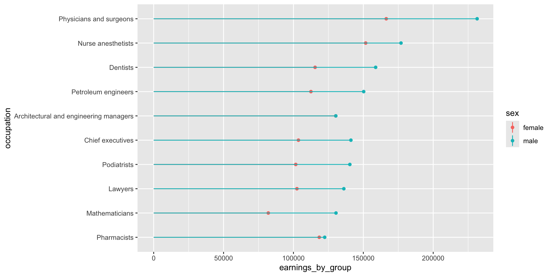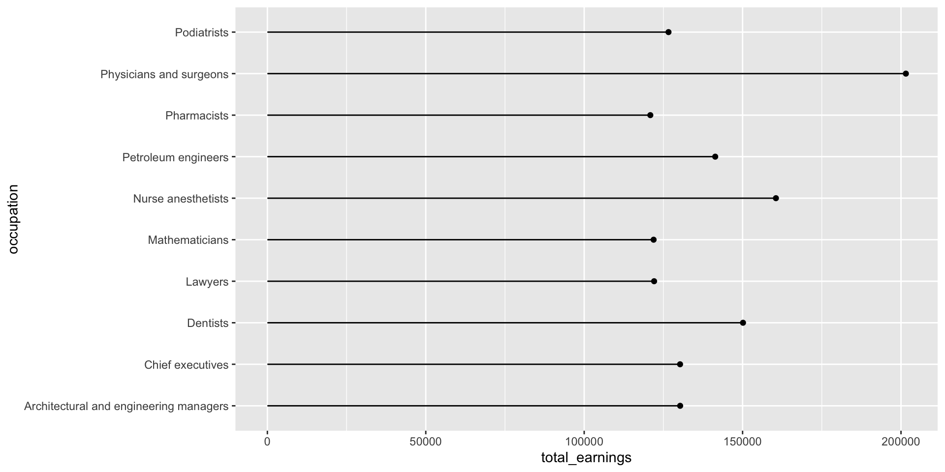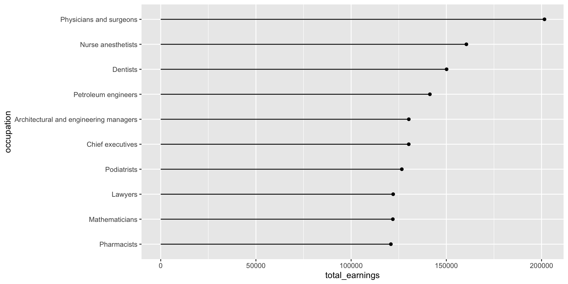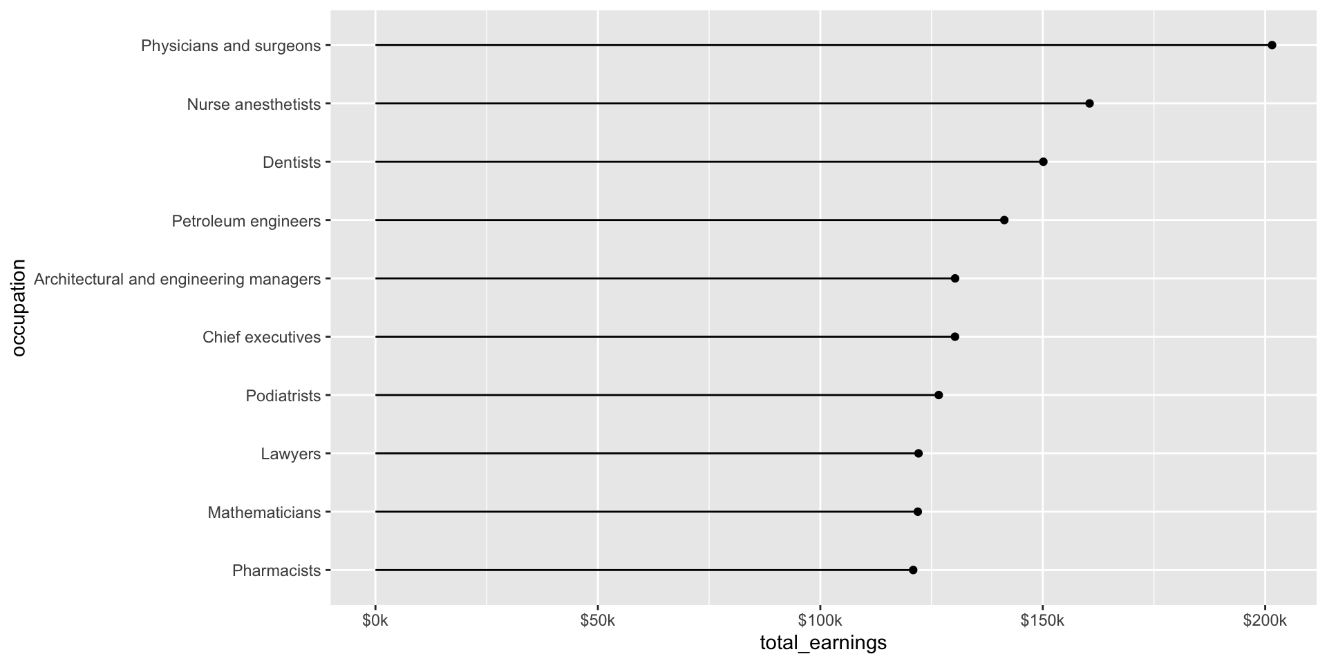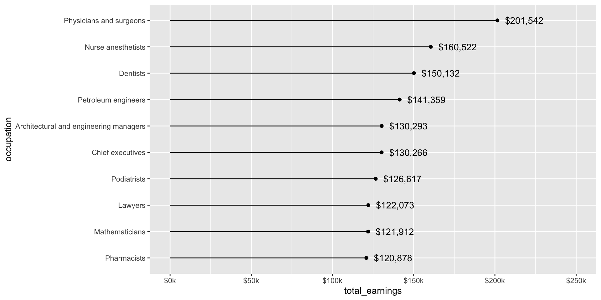 jobs_clean |>filter(year ==2016) |>slice_max(order_by = total_earnings, n =10) |>mutate(occupation =fct_reorder(.f = occupation, .x = total_earnings)) |>ggplot(aes(x = occupation, y = total_earnings)) +geom_point() +geom_segment(aes(y =0, yend = total_earnings)) +geom_text(aes(label = scales::dollar(total_earnings)), hjust =-0.2) +scale_y_continuous(labels = scales::label_currency(accuracy =1, scale =0.001, suffix ="k"),limits =c(0, 250000)) +# expand axis to make room for valuescoord_flip()
