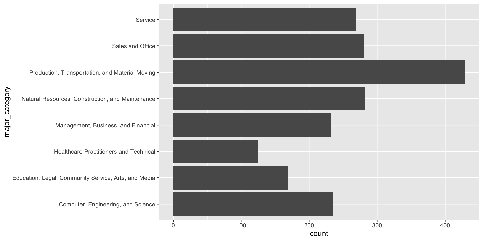 Use geom_bar() if you want to ggplot to count up numbers of rows and map those counts to the height of bars in your plot. E.g. we want to know how many occupations are included for each major category in our jobs_gender_clean data set (NOTE: we don’t have a count column in our data frame):