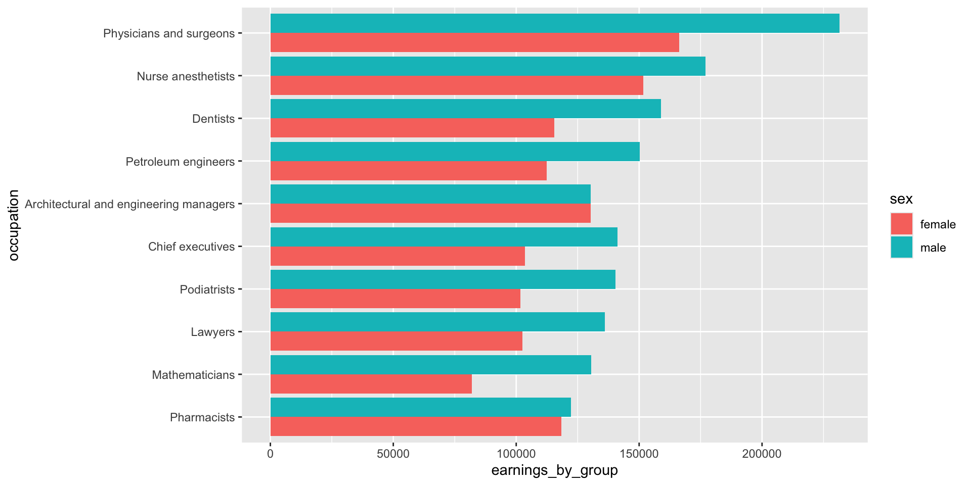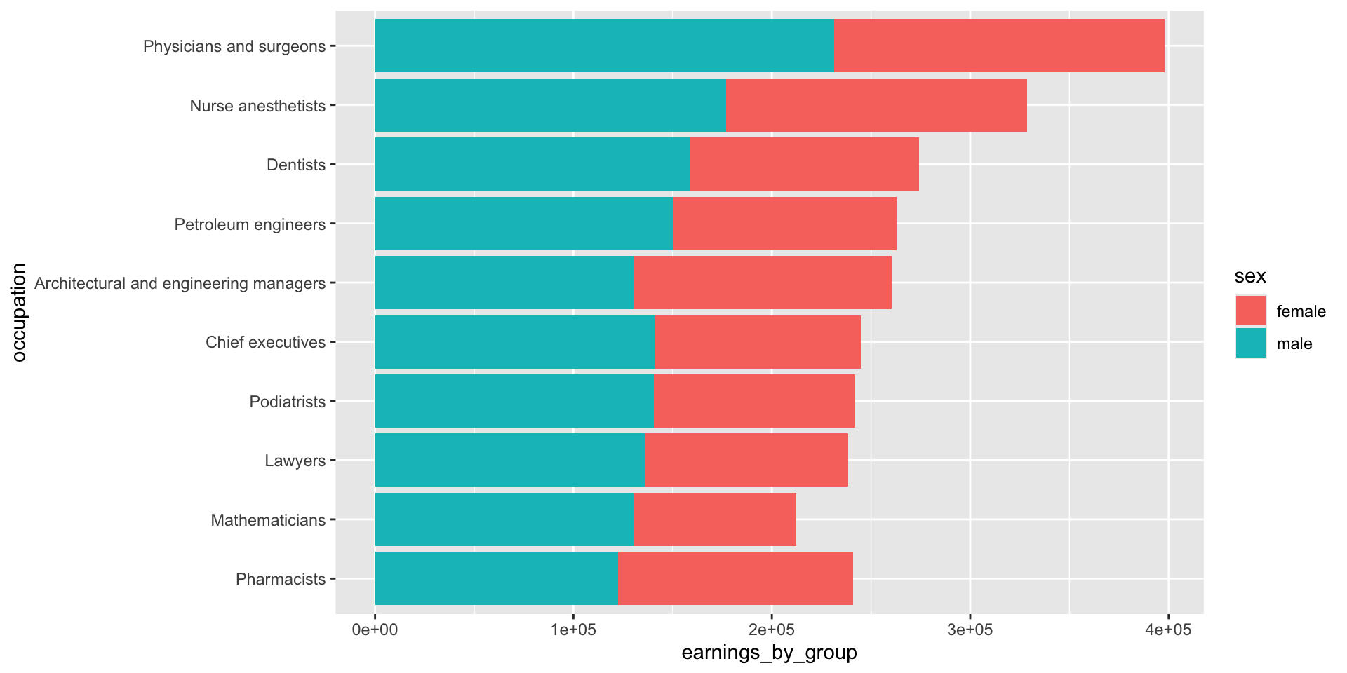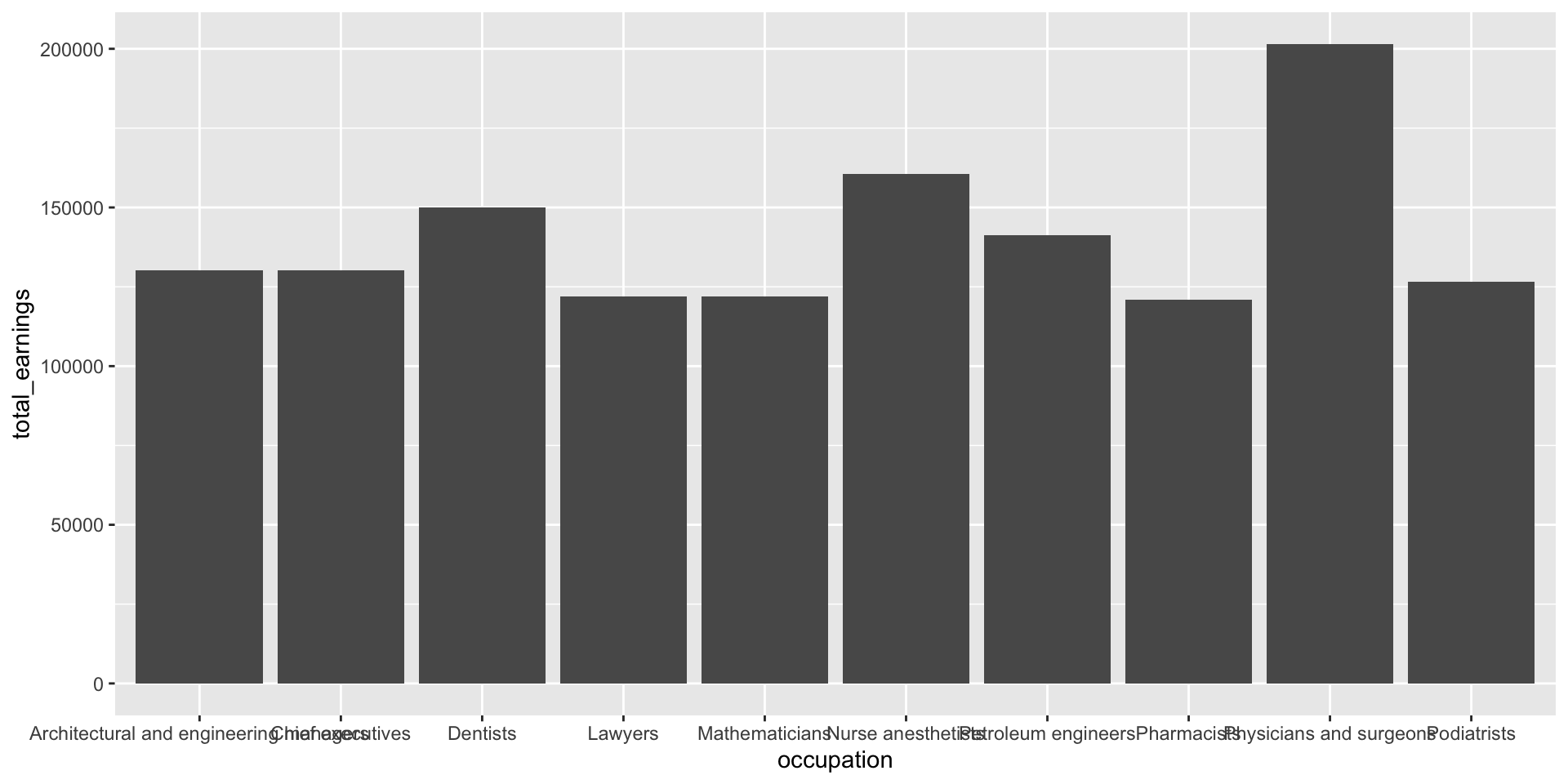 Give those long x-axis labels some breathing room using coord_flip(), which flips cartesian (x,y) coordinates so that the horizontal becomes the vertical and vice versa. Alternatively, you can map your variables to the opposite axes in aes() (e.g. aes(x = total_earnings, y = occupation)).