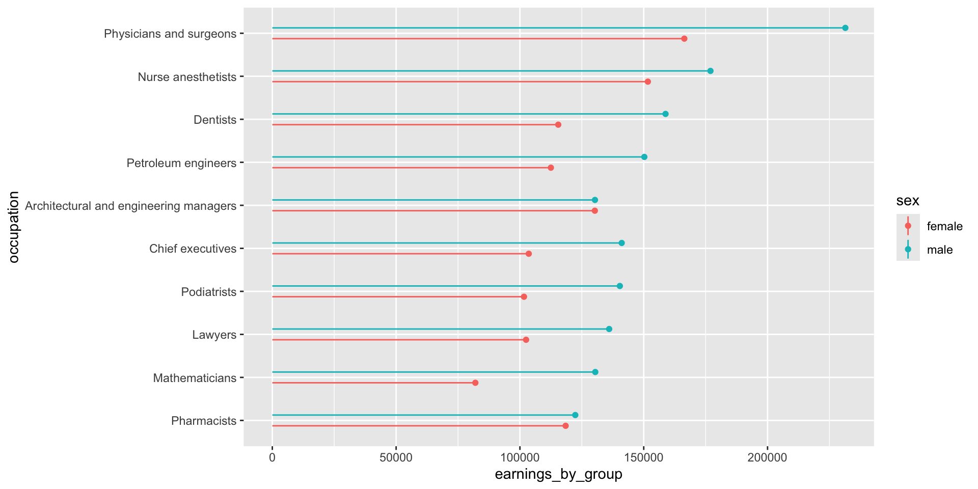 Let’s say we want to explore the difference in median salaries between male and female workers, by occupation. We can use a dumbbell (aka Cleveland) plot to display median salaries (numeric) for female and male workers (categorical), by occupation (categorical):