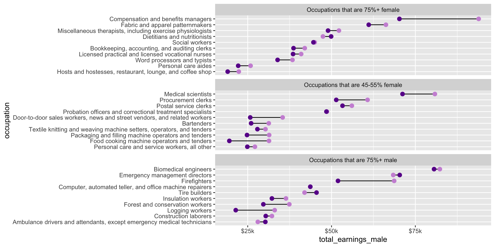 ##~~~~~~~~~~~~~~~~~~~~~~~~~~~~~~~~~~~~~~~~~~~~~~~~~~~~~~~~~~~~~~~~~~~~~~~~~~~~~~## plot ----##~~~~~~~~~~~~~~~~~~~~~~~~~~~~~~~~~~~~~~~~~~~~~~~~~~~~~~~~~~~~~~~~~~~~~~~~~~~~~~# initialize plot (we'll map our aesthetics locally for each geom, below) ----ggplot(subset_jobs) +# create dumbbells ----geom_linerange(aes(y = occupation,xmin = total_earnings_female, xmax = total_earnings_male)) +geom_point(aes(x = total_earnings_male, y = occupation), color ="#CD93D8", size =2.5) +geom_point(aes(x = total_earnings_female, y = occupation), color ="#6A1E99", size =2.5) +# facet wrap by group ----facet_wrap(~group_label, nrow =3, scales ="free_y") +# "free_y" plots only the axis labels that exist in each group# axis breaks & $ labels ----scale_x_continuous(labels = scales::label_currency(scale =0.001, suffix ="k"),breaks =c(25000, 50000, 75000, 100000))