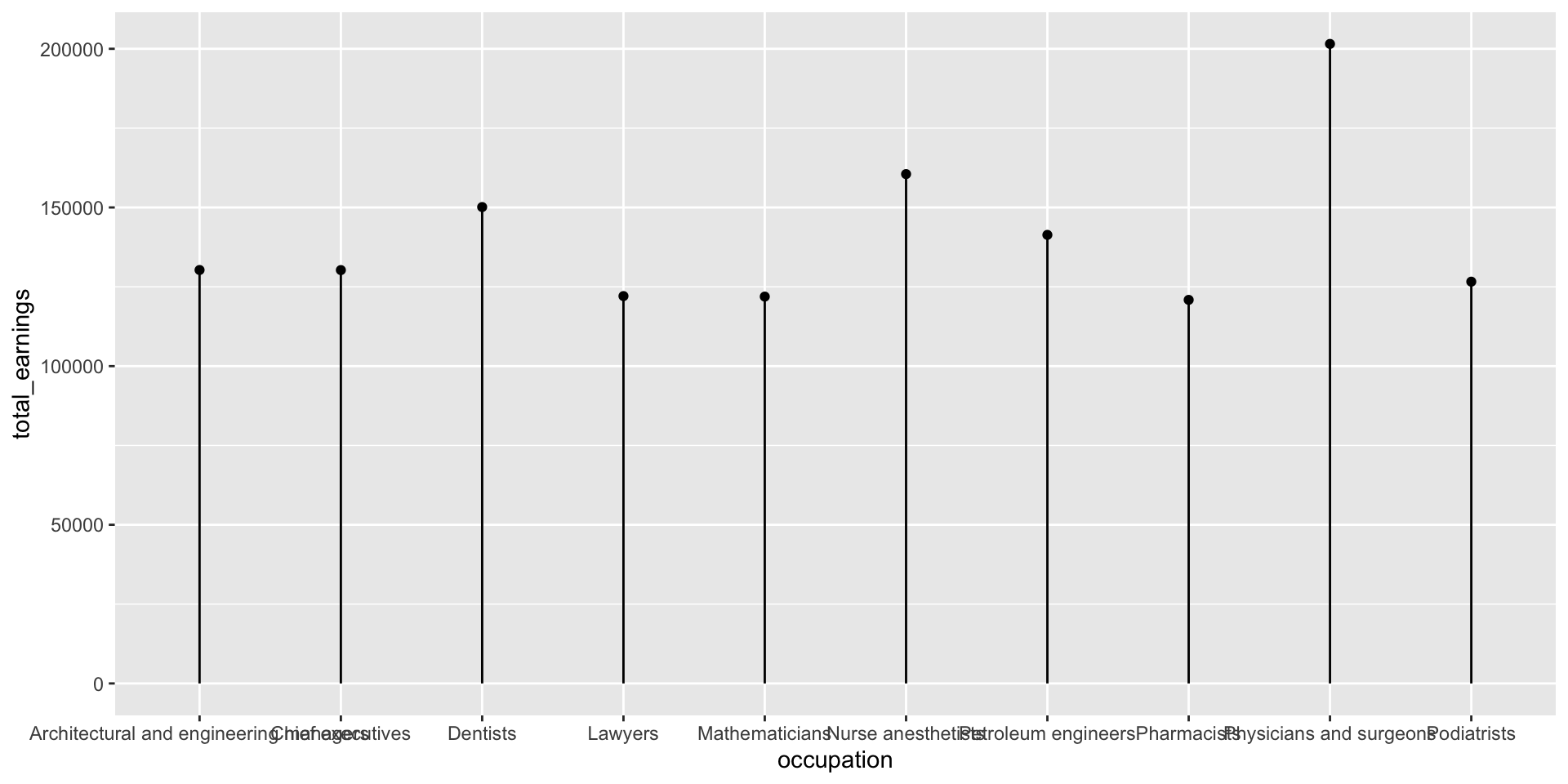 jobs_clean |>filter(year ==2016) |>slice_max(order_by = total_earnings, n =10) |>ggplot(aes(x = occupation, y = total_earnings)) +geom_point() +geom_linerange(aes(ymin =0, ymax = total_earnings))