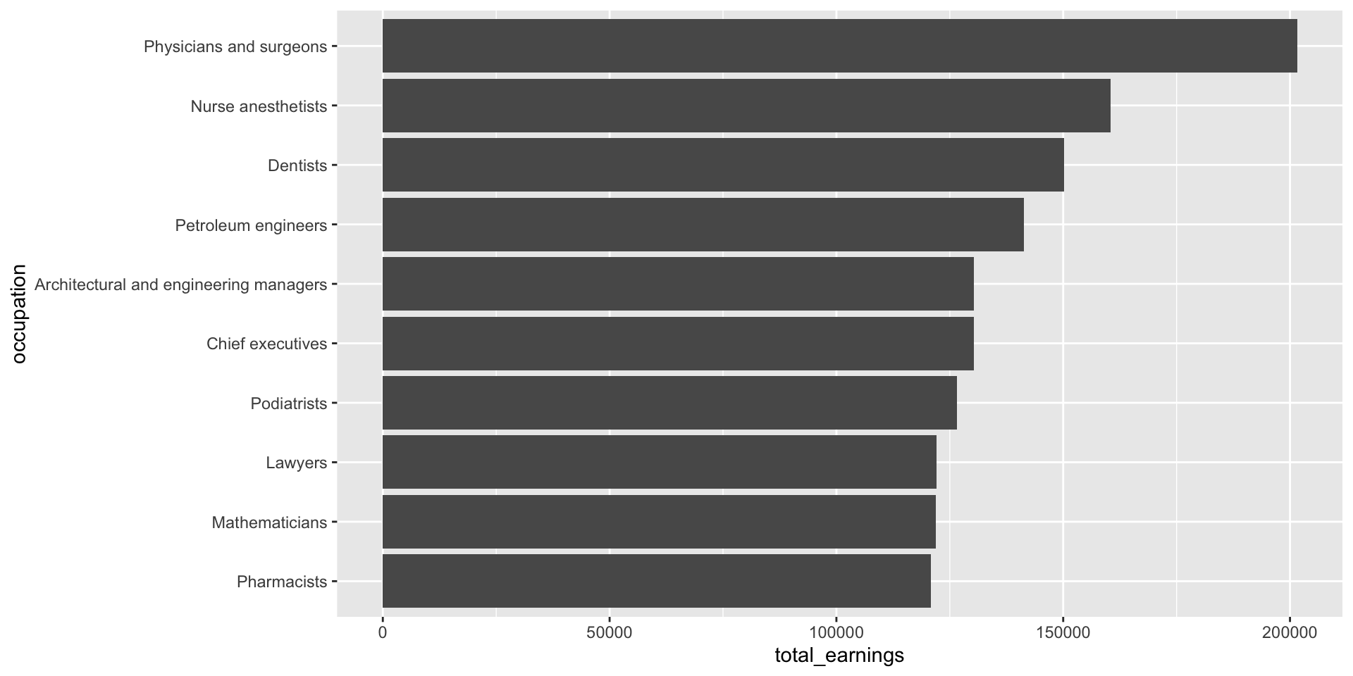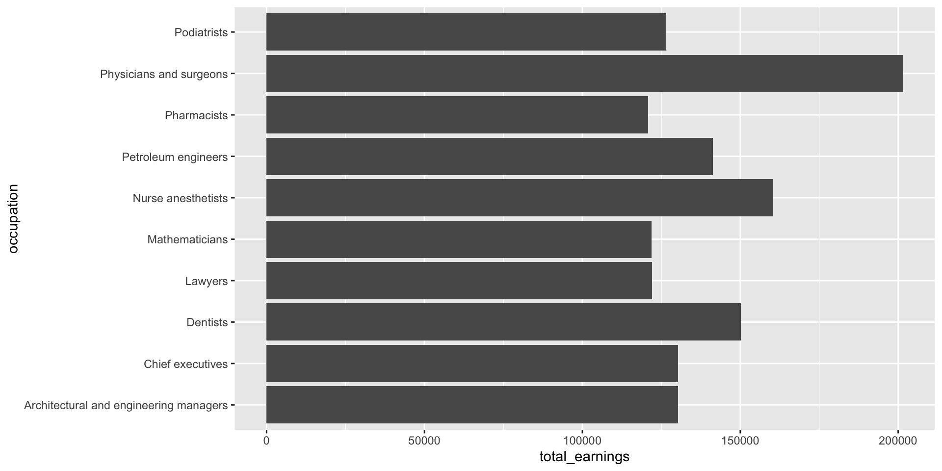 jobs_clean |>filter(year ==2016) |>slice_max(order_by = total_earnings, n =10) |>ggplot(aes(x = occupation, y = total_earnings)) +geom_col() +coord_flip()