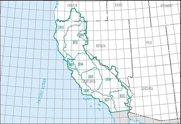 (Left) Source: Hydrologic Unit Codes (HUCs) Explained; Hydrologic units are identified using 12-digit hydrologic unit codes (HUC12s), which can be parsed into shorter codes representing larger spatial units (e.g. regions, subregions, subbasins). | (Right) California region (HUC 18), with its ten 4-digit subregion hydrologic unit boundaries. Source: Wikipedia