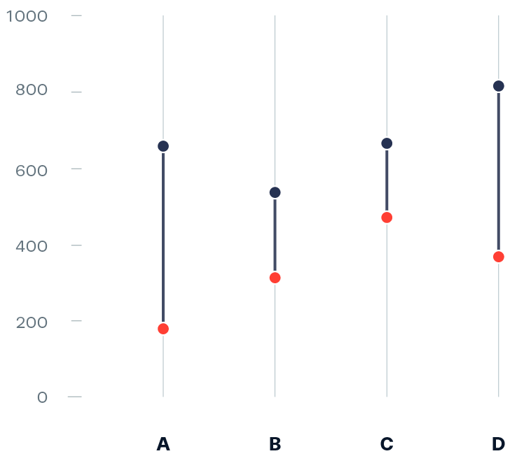 Because dot plots encode values by position, truncating the axis doesn’t distort comparisons. The axis does not have to start at zero.
