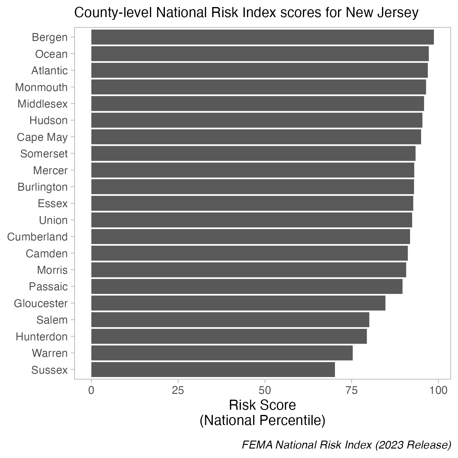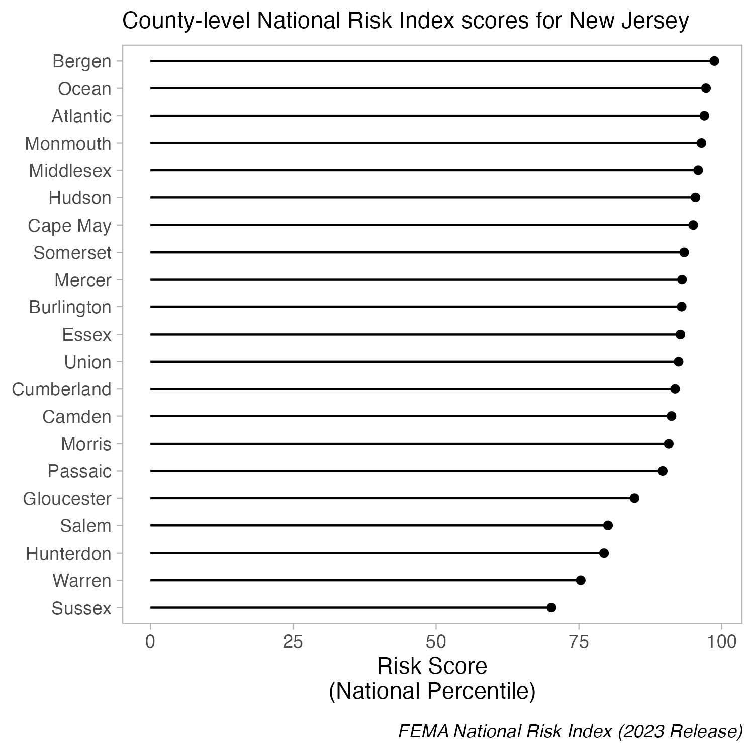 When bars are all long and have nearly the same length, the eye is drawn to the middle of the bars rather than to their end points. A lollipop plot is a bit less distracting (less ink), but still difficult to differentiate risk scores across counties. When we limit the axis range in a dot plot, it becomes easier to identify differences in the max and min values.