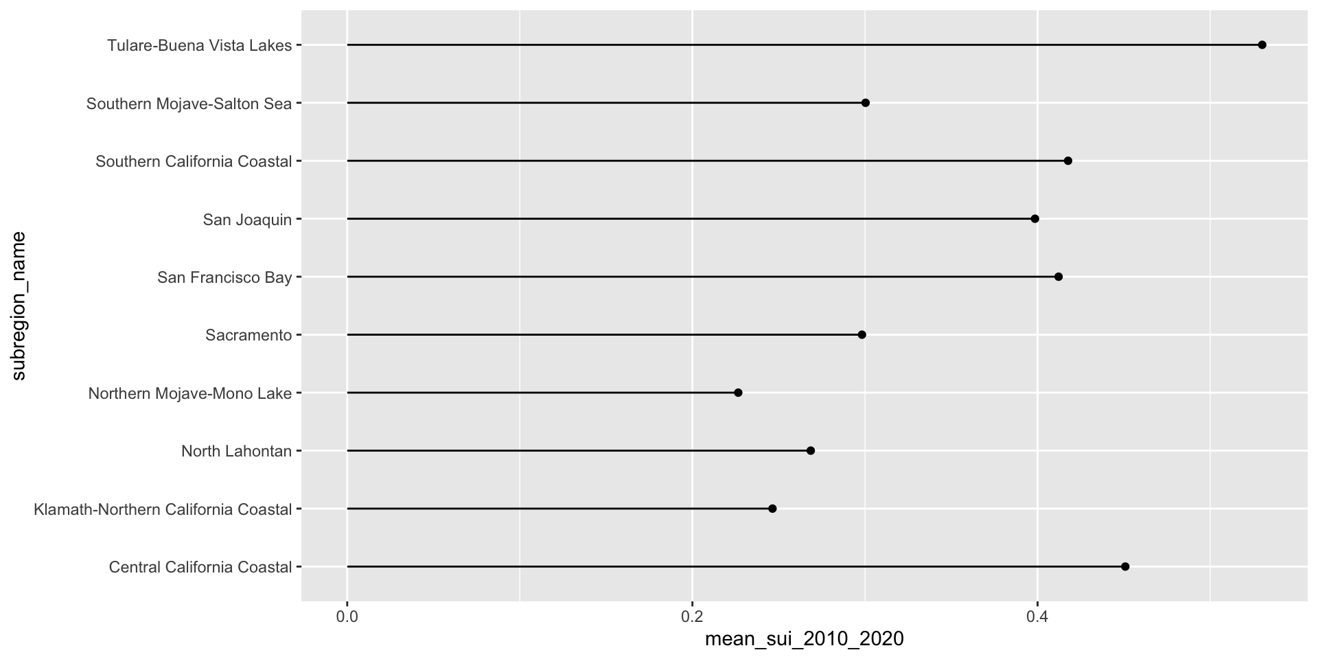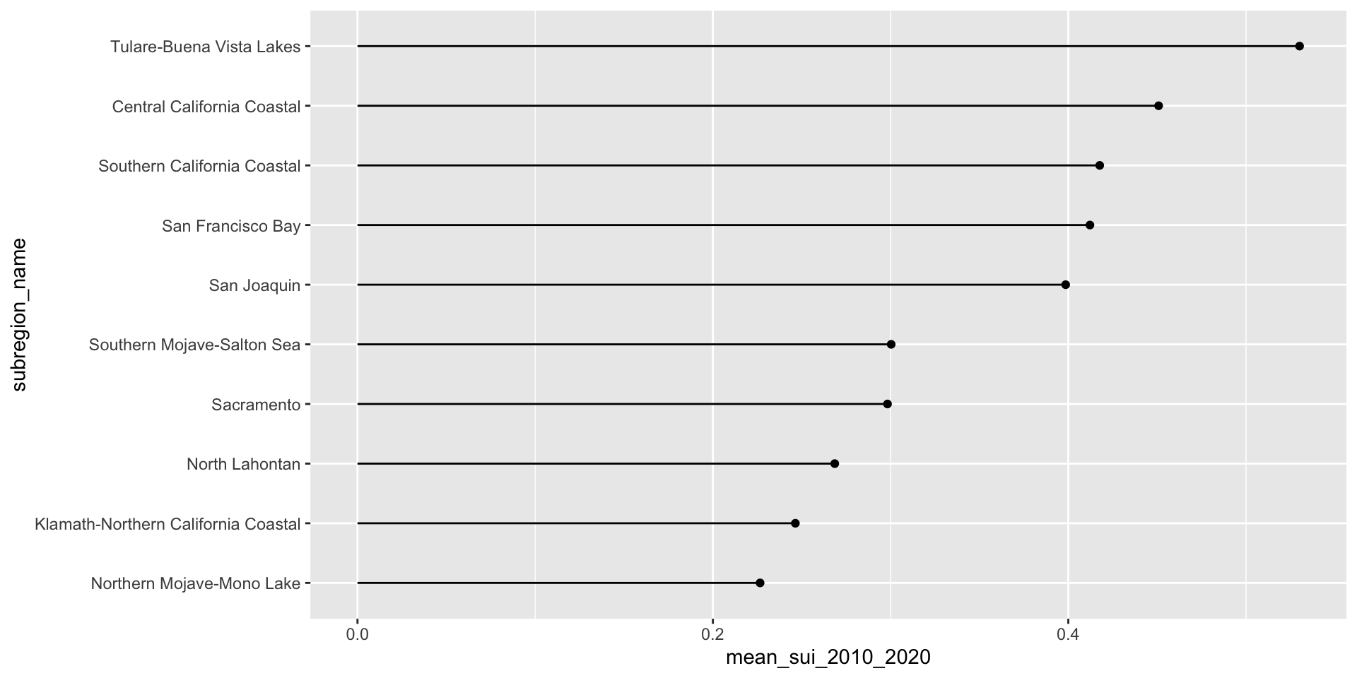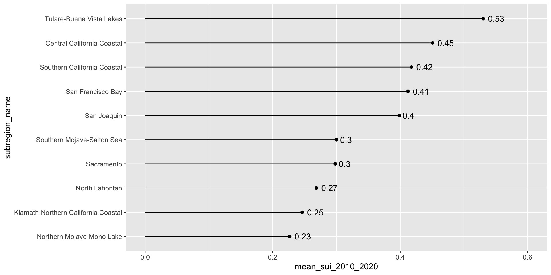 Let’s first look at the long-term mean Surface Water-Supply and Use Index (SUI) across the ten HUC 18 subregions. Higher SUI values indicate greater water stress. Each bar and lollipop represents the mean SUI for a given subregion, calculated by averaging all monthly SUI values from 2010–2020.