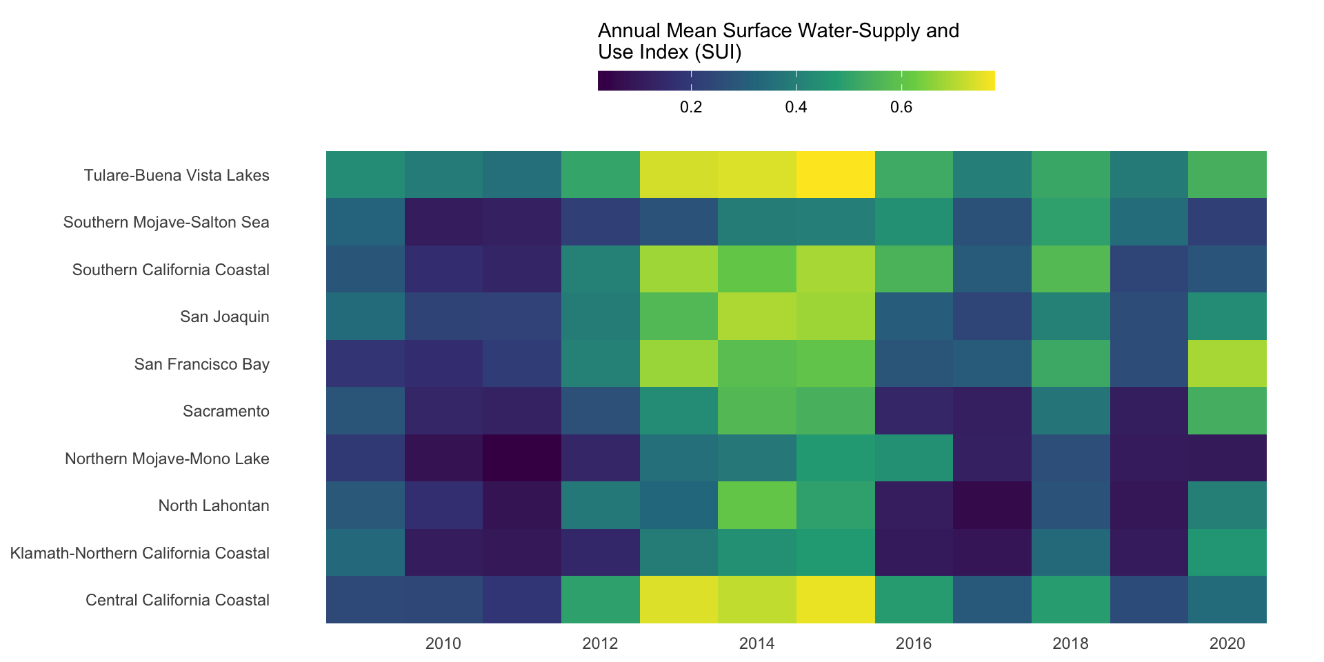 labs(fill = "Annual Mean Surface Water-Supply and\nUse Index (SUI)") + # caption = "A higher index value indicates greater water stress."