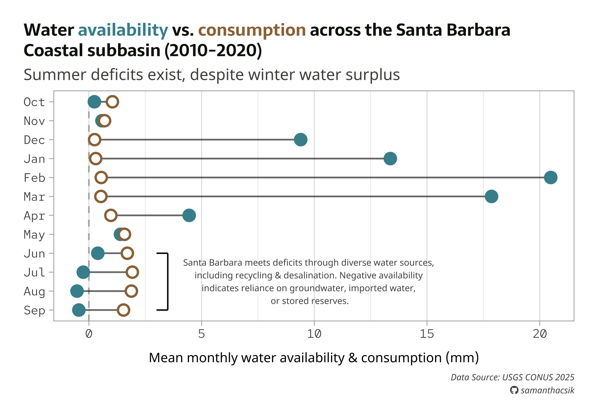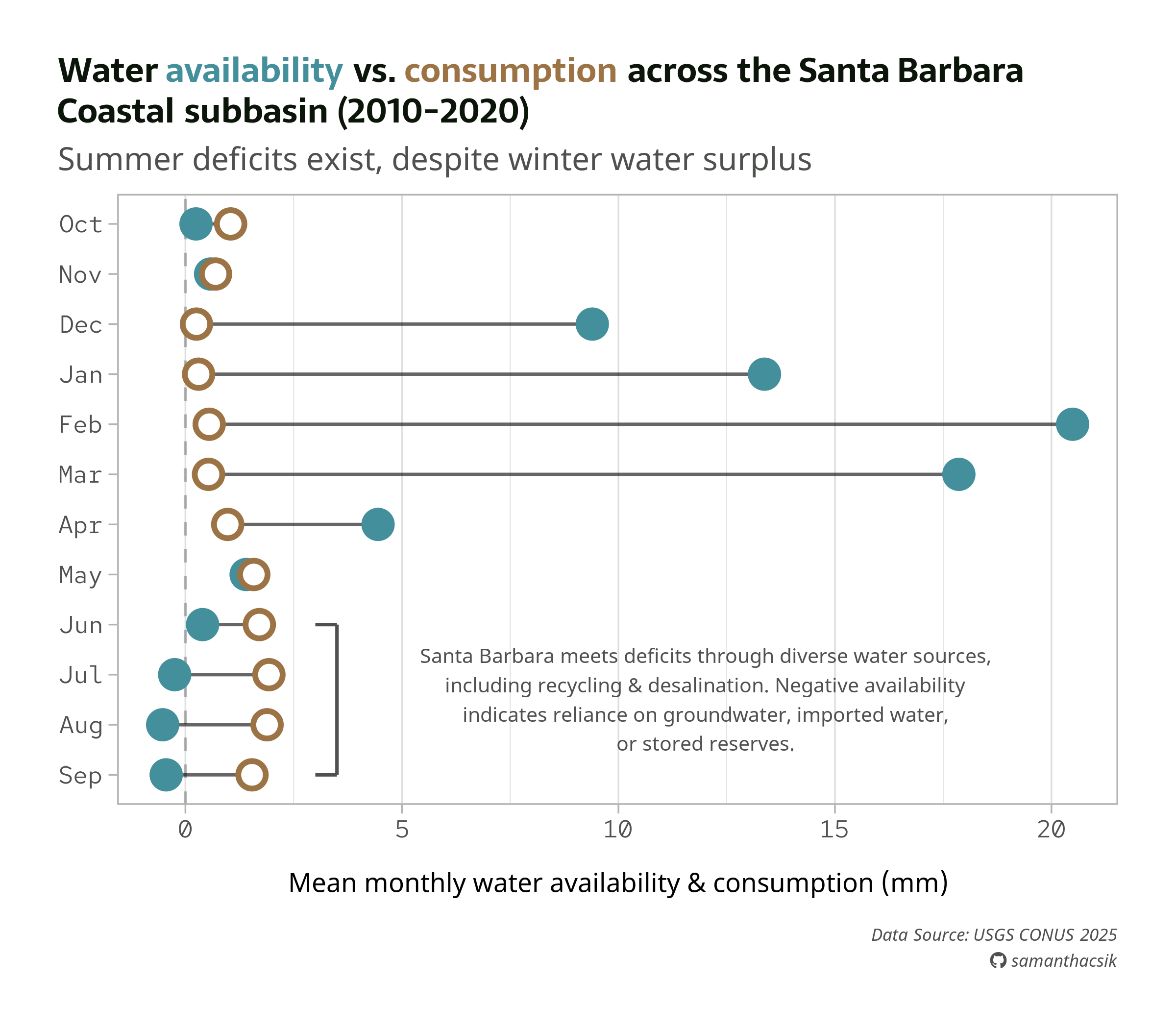 Now that we know the right approach for adding single text elements to our plot, let’s add something a bit more helpful and aesthetic. We’ll construct a bracket to bound the data for Jun > Sep, then add text that describes how Santa Barbara handles water deficits, as well as how to interpret negative availability values. Full plot text is included: