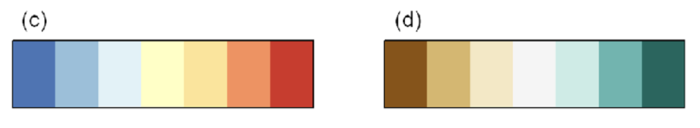 Figure 4. Appropriate diverging and sequential colour schemes for the following climate data (a), absolute temperature (b), absolute precipitation (c), temperature anomaly (d), precipitation or runoff anomaly (e and f) other climate variables with no symbolic association . Schemes in this figure are 7 class ones designed by Cynthia Brewer, (Brewer et al. 2003)