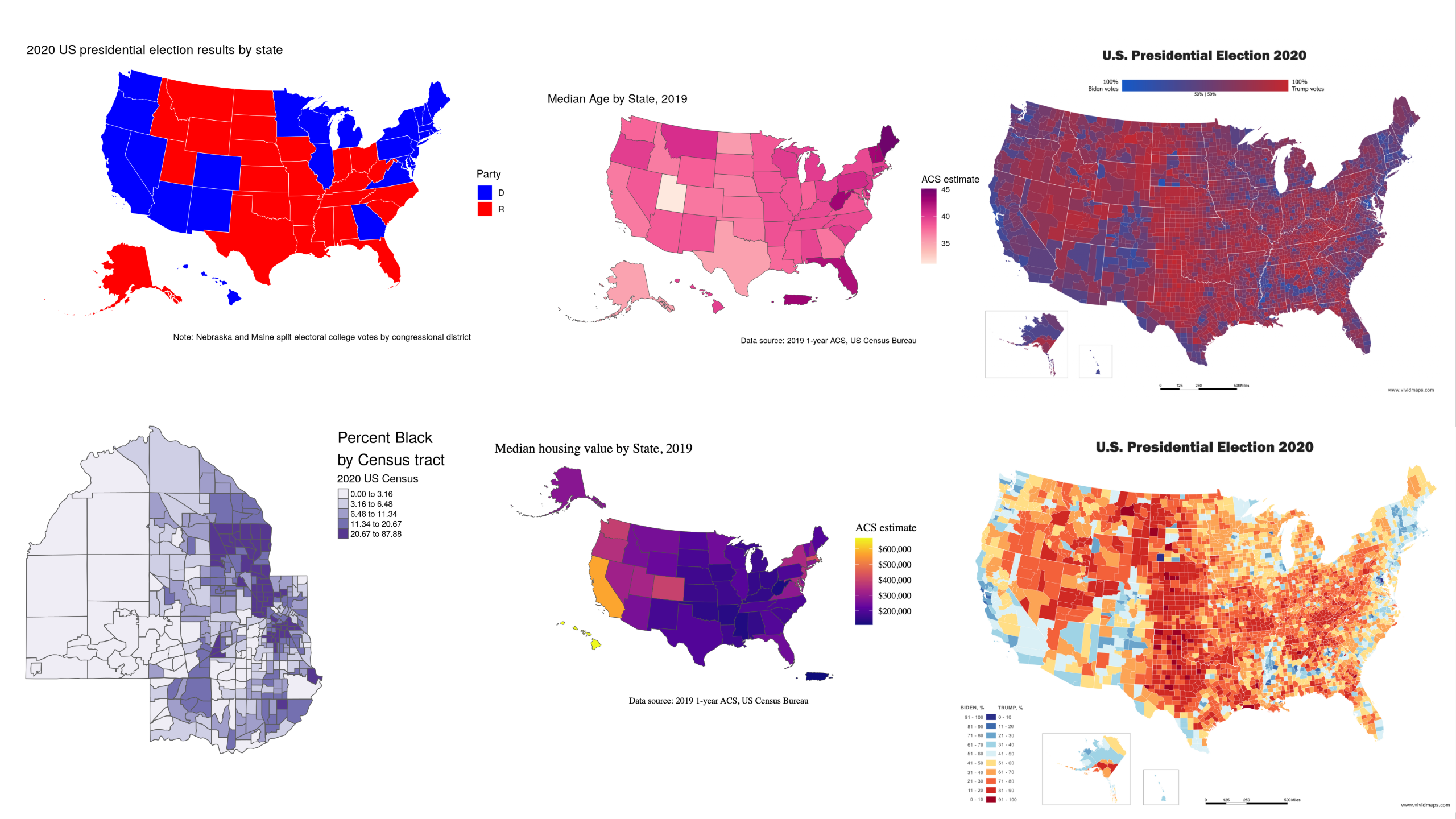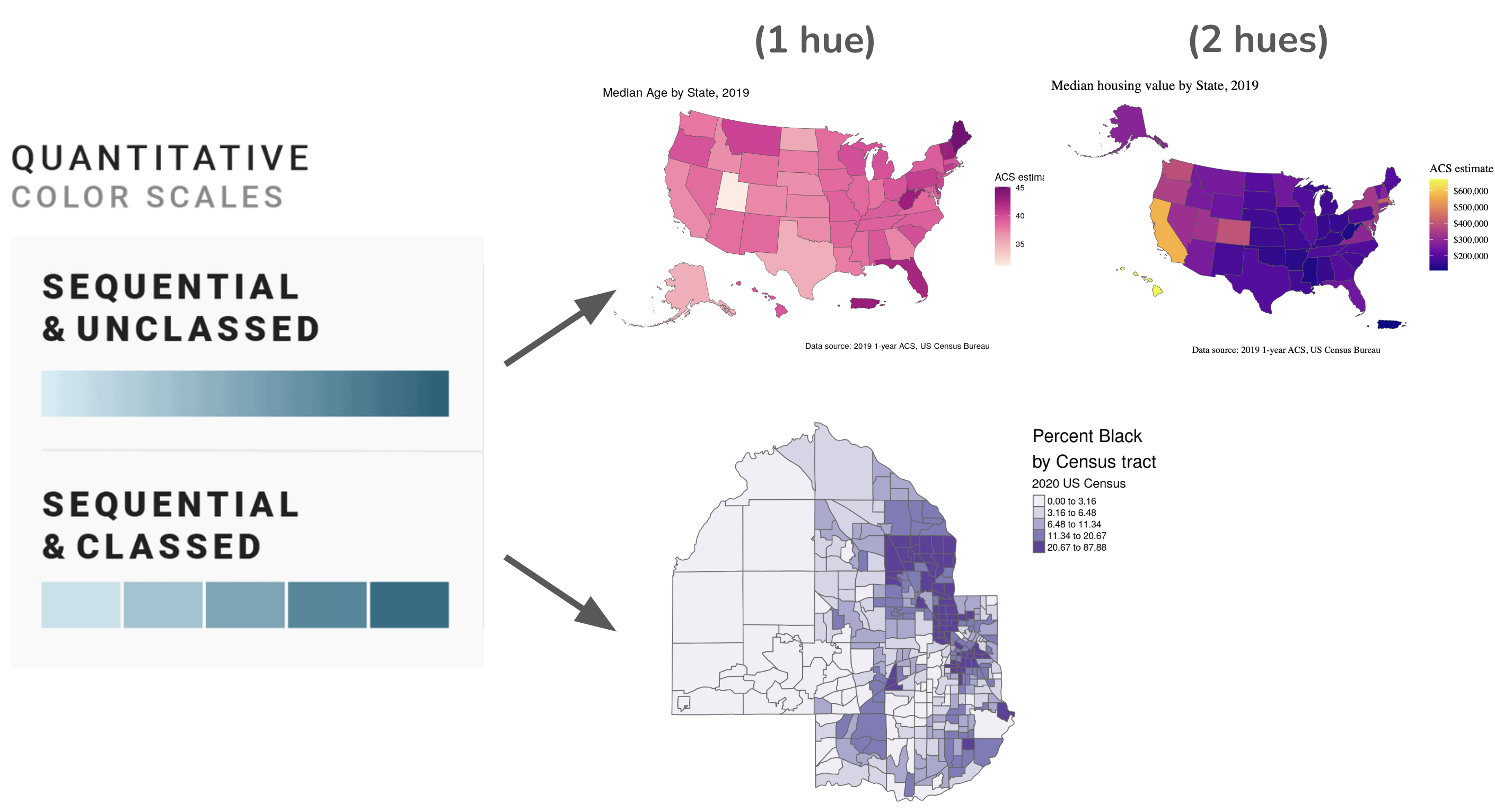Consider the data types and use of color in each choropleth map. What do you notice about the different approaches to using color? How does each approach affect what patterns or stories emerge from the data?