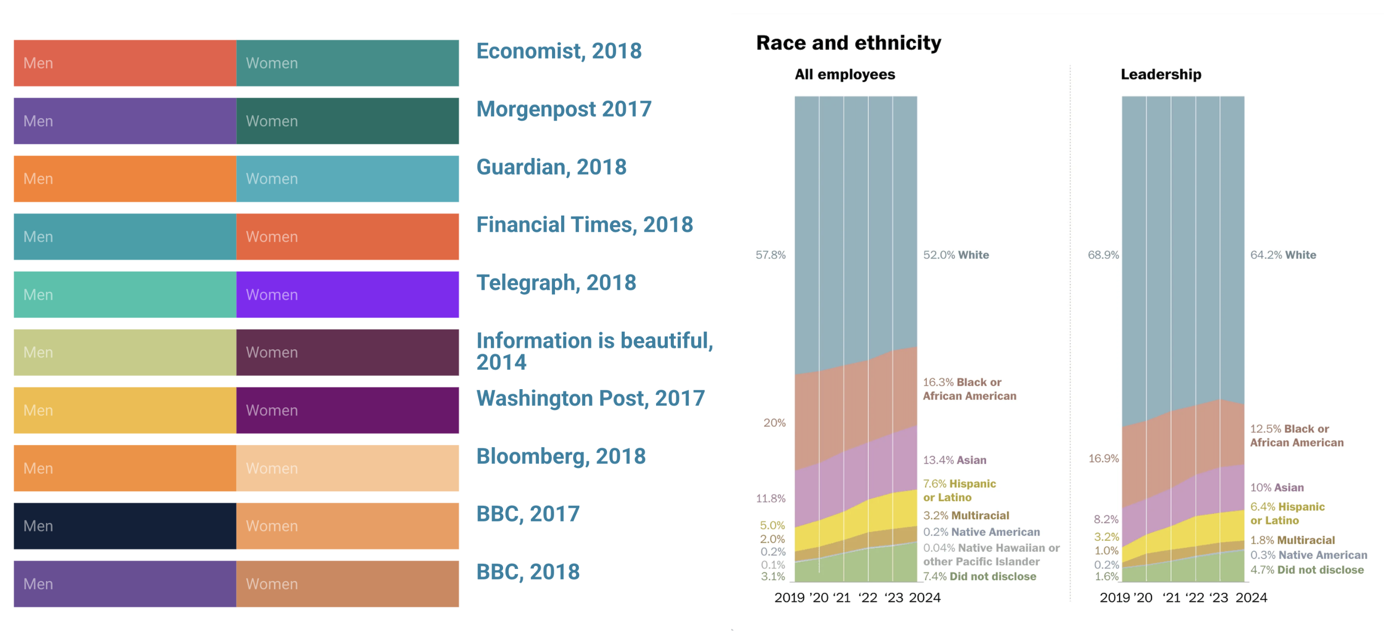 Many newsrooms avoid pink/blue altogether, but choices are not consistent | Avoid steretypical skin colors, don’t use gray for “other” or “multiracial” categories, use less saturated colors (saturated colors have strong associations, e.g. green as positive or right, red as dangerous or important), and keep shuffling your colors!