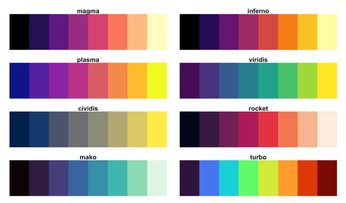 Use the right function (all part of {ggplot2}) for the type of data / palette: