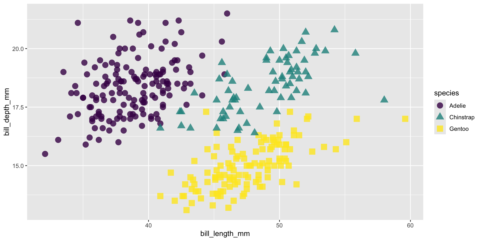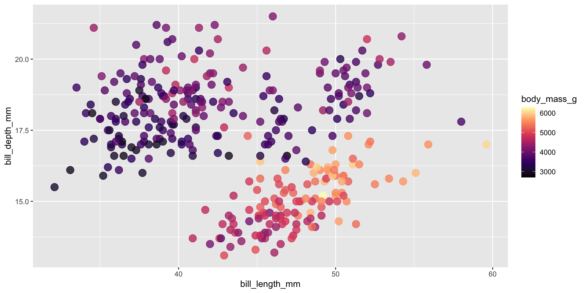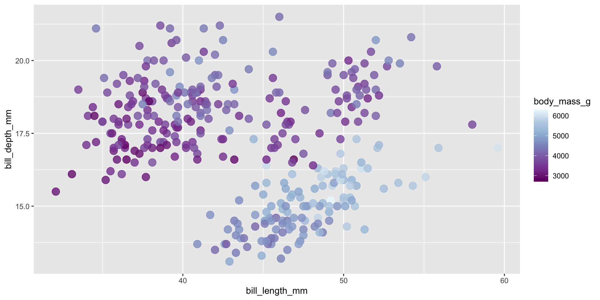 We’ll be testing out different palettes throughout this lesson. Instead of having to retype the code for our plots each time, let’s create and save two versions of a penguin scatter plot. We can then call either of these plot objects to modify with different color scales: