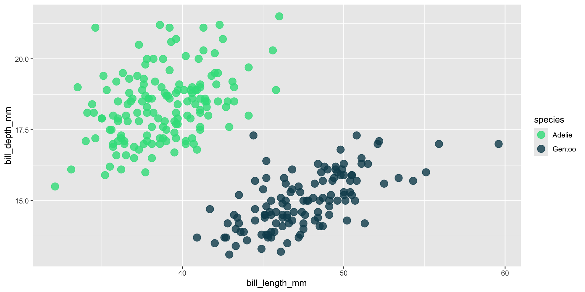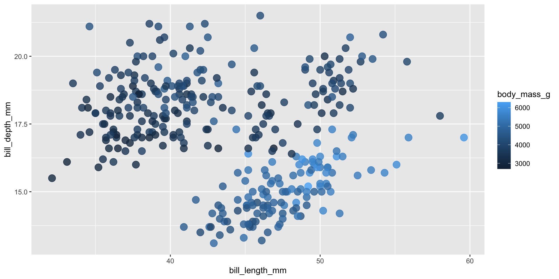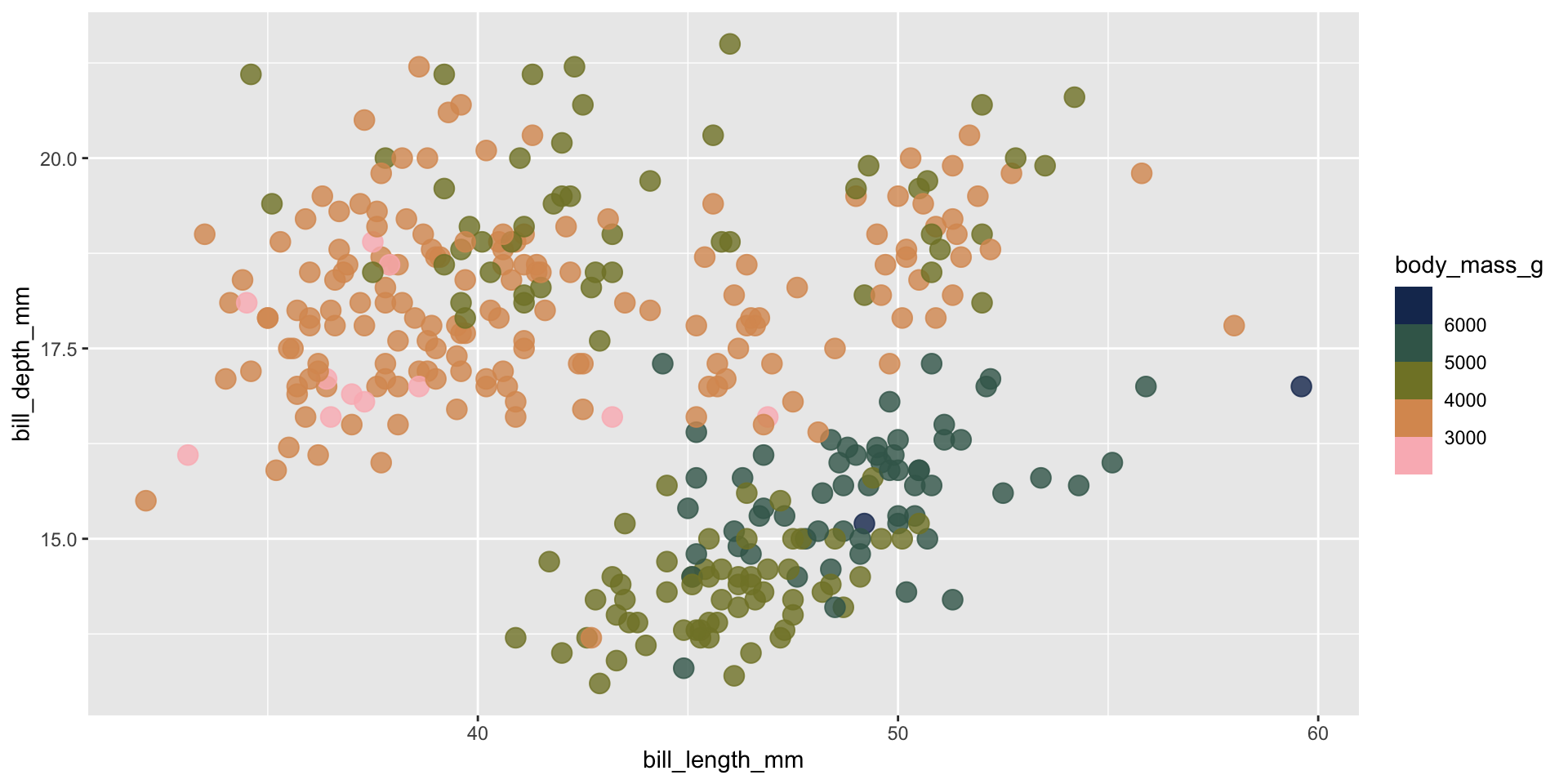 We’ll be testing out different palettes throughout this lesson. Instead of having to retype the code for our plots each time, let’s create and save two versions of a penguin scatter plot. We can then call either of these plot objects to modify with different color scales: