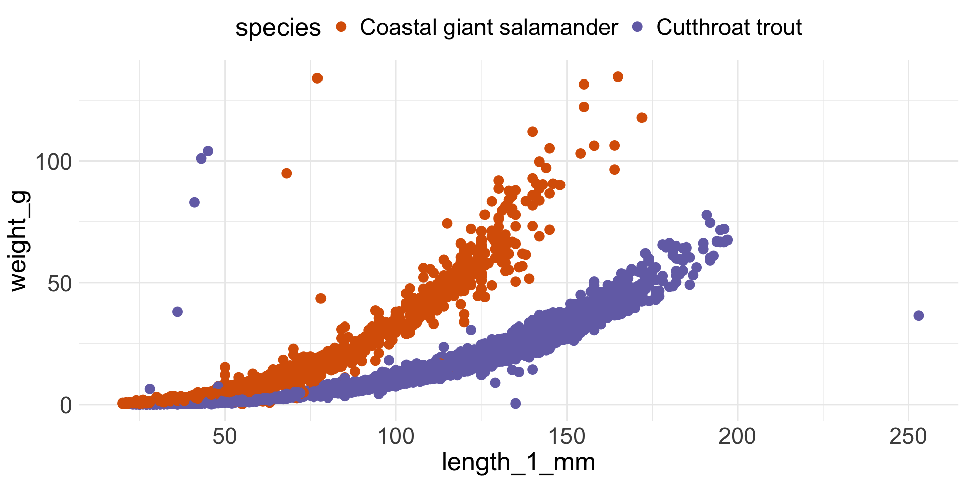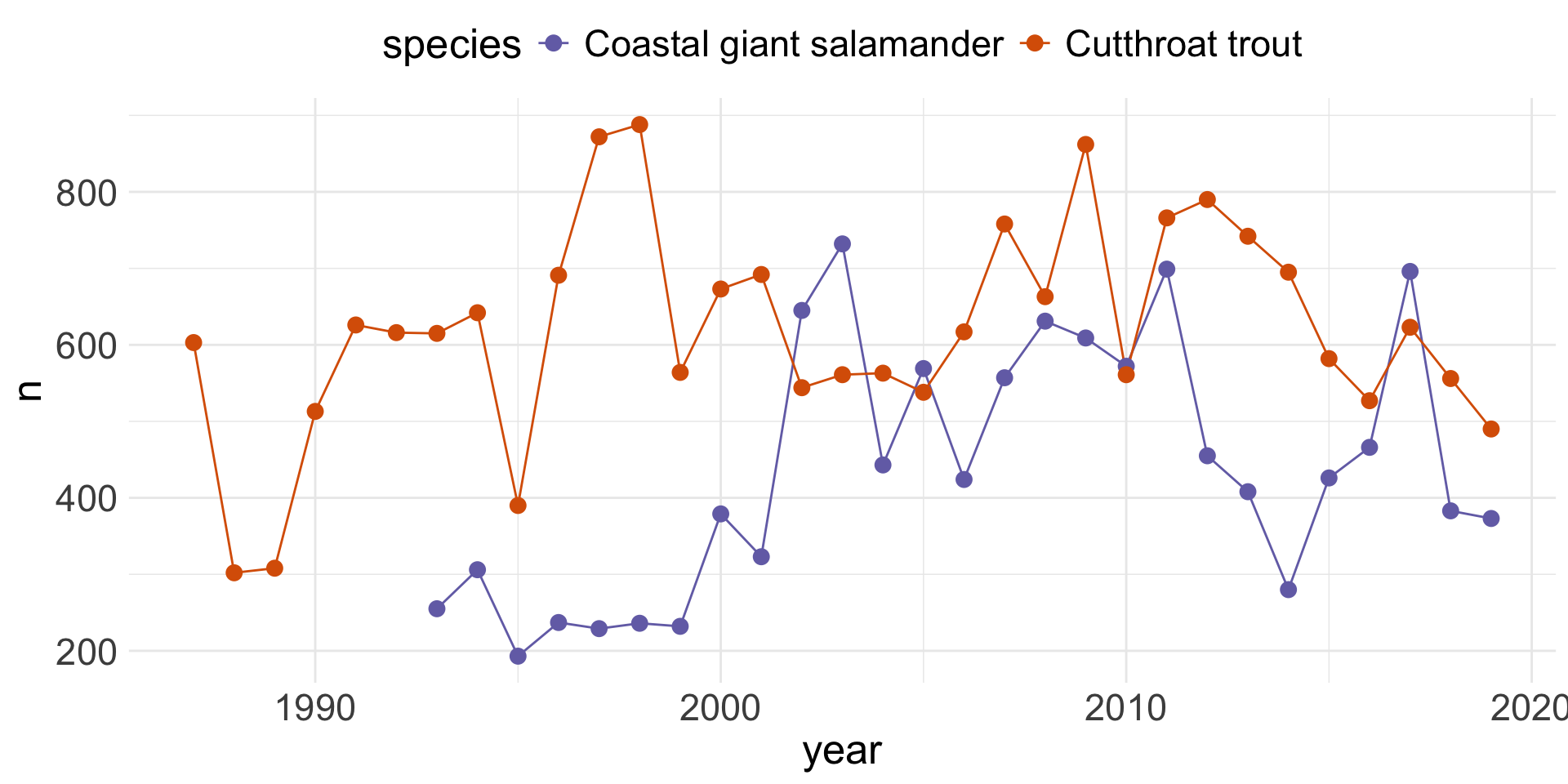 Data: Andrews Forest LTER Mack Creek cutthroat trout and salamanders (AND) from the {lterdatasampler} package