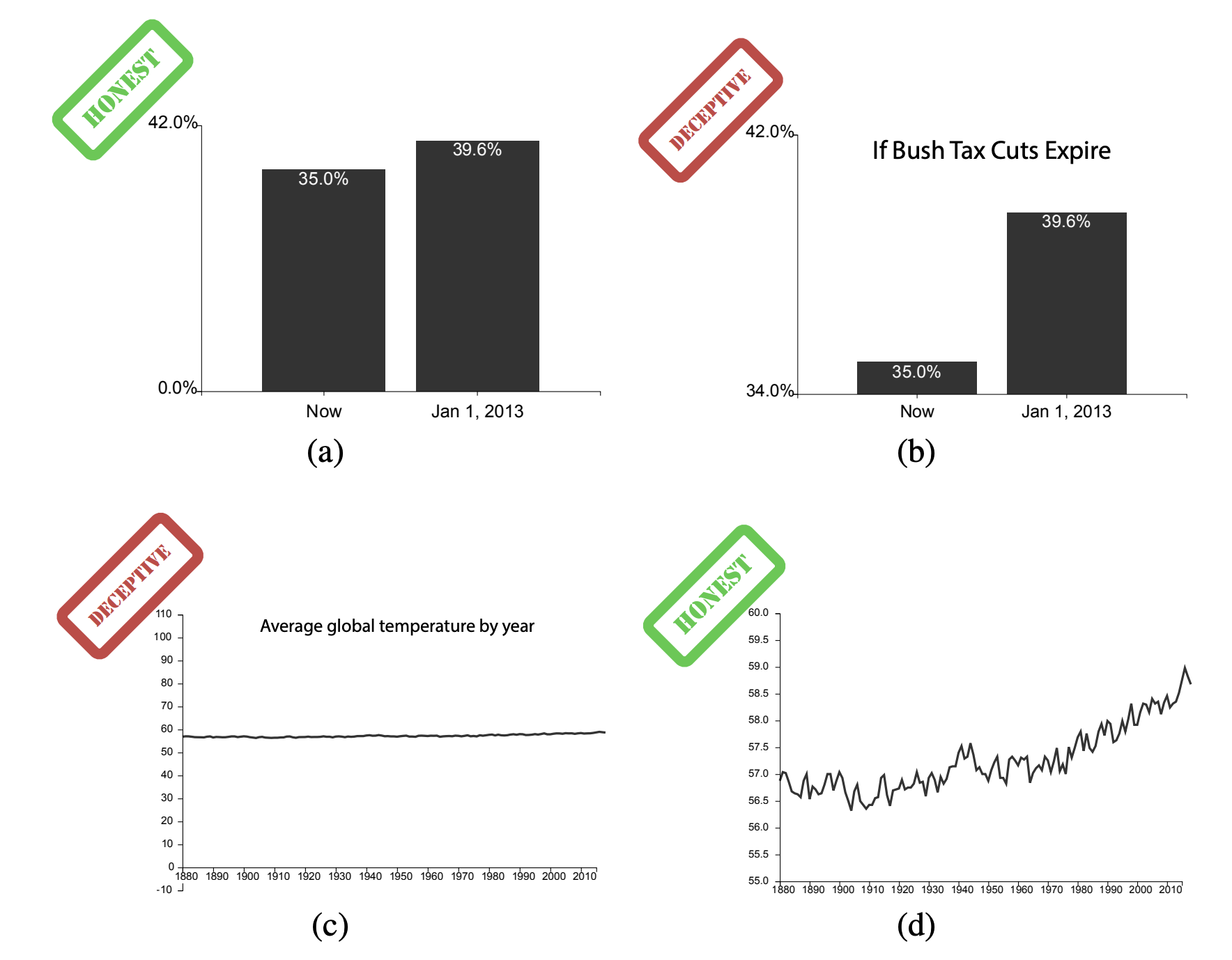 The y-axis starts at 34%, making an increase of 5% look quite dramatic. This misleading drama is why we are often told to never ever ever start the y-axis of a bar chart from anything other than 0, to avoid the scenario where the visual difference between bars becomes disconnected from the actual difference in the data…Sometimes, however, the effect sizes you care about don’t care about your 0s. An increase in global average temperature of even a degree or so is a big deal, so starting the y-axis at 0ºF obscures the important changes over time you’d want to see. This is why, when we design line charts, we pay special attention to the aspect ratio of our charts so that people can correctly estimate the rate of change in the data.