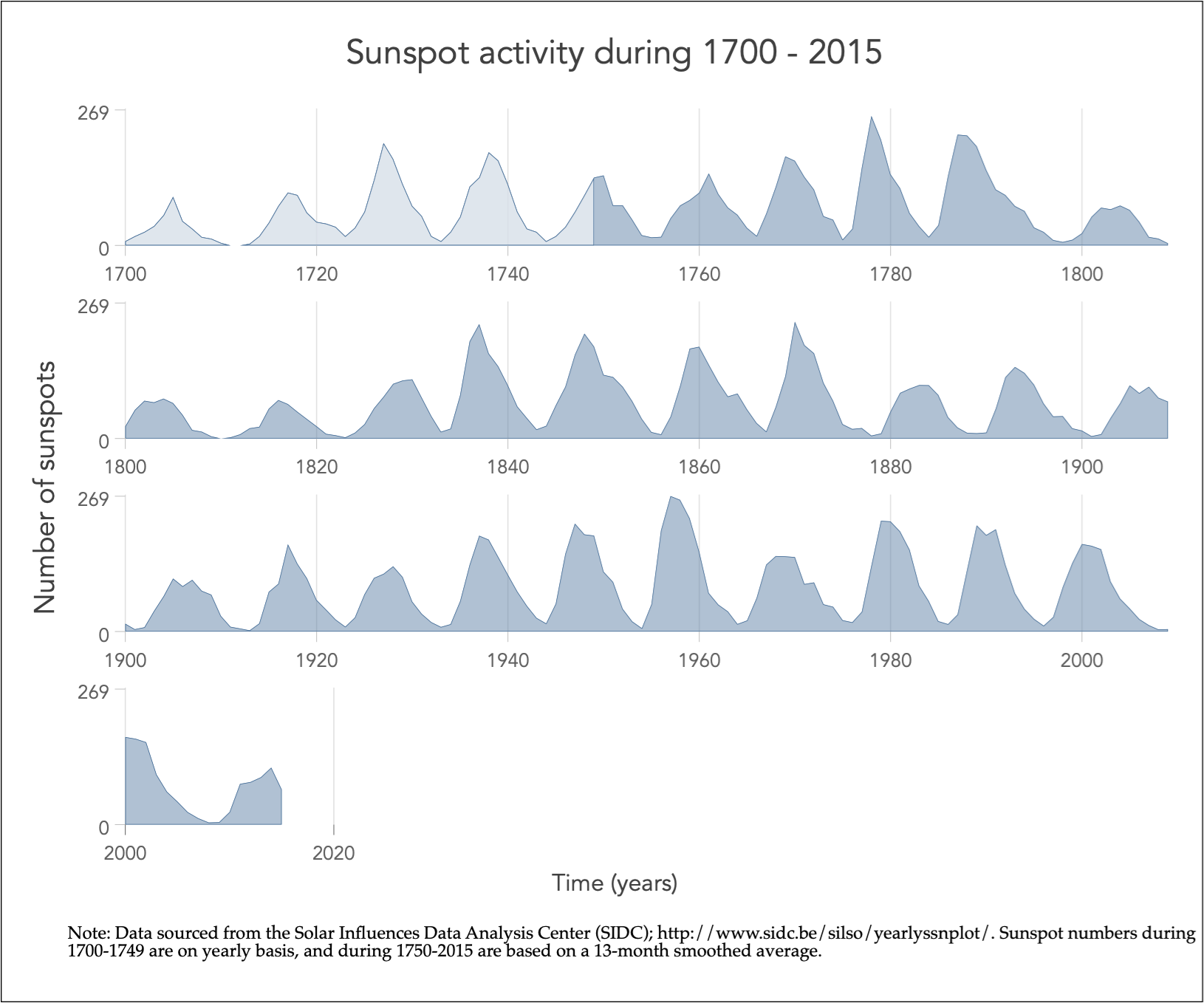 With a wider aspect ratio, we can more clearly see the differences in rates of change (slopes) in sunspot activity through time.