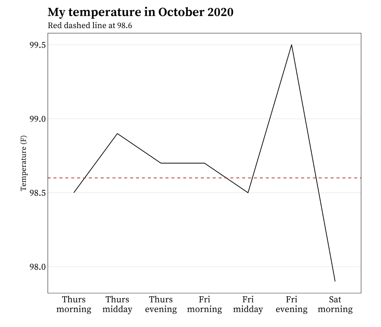 Do not start the y-axis at 0 if the range of data is small but the distance from the bottom of the range to zero is large. For example: