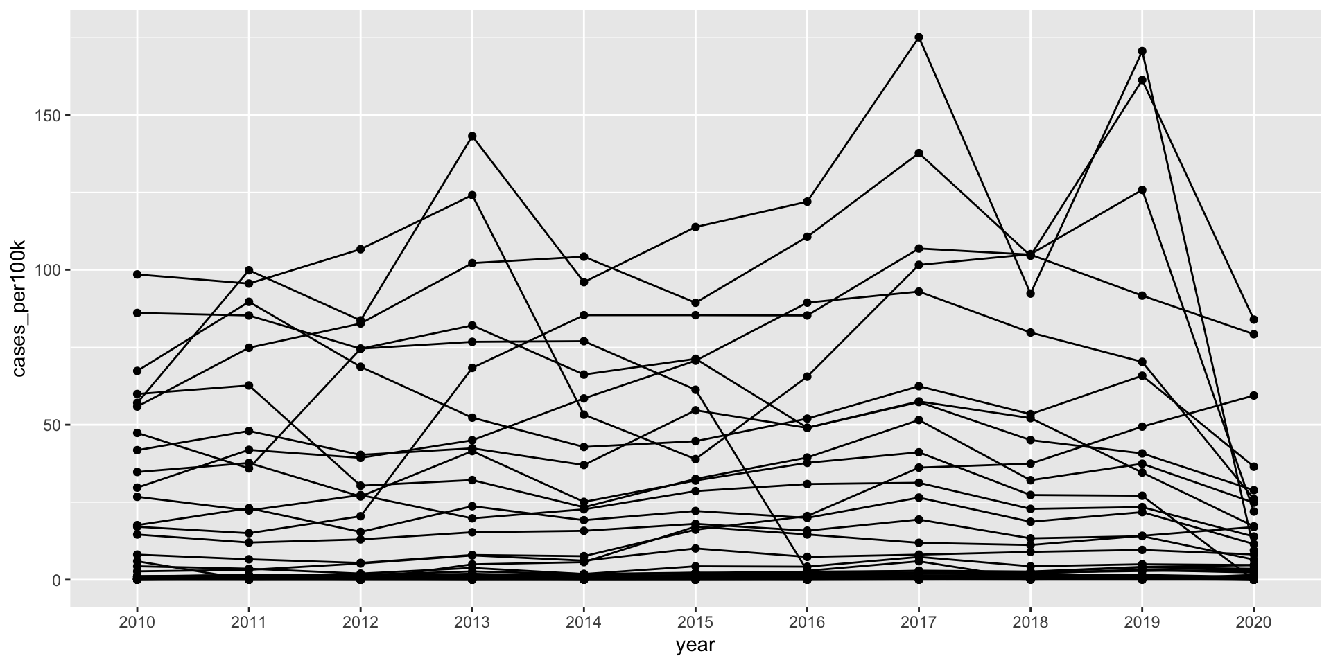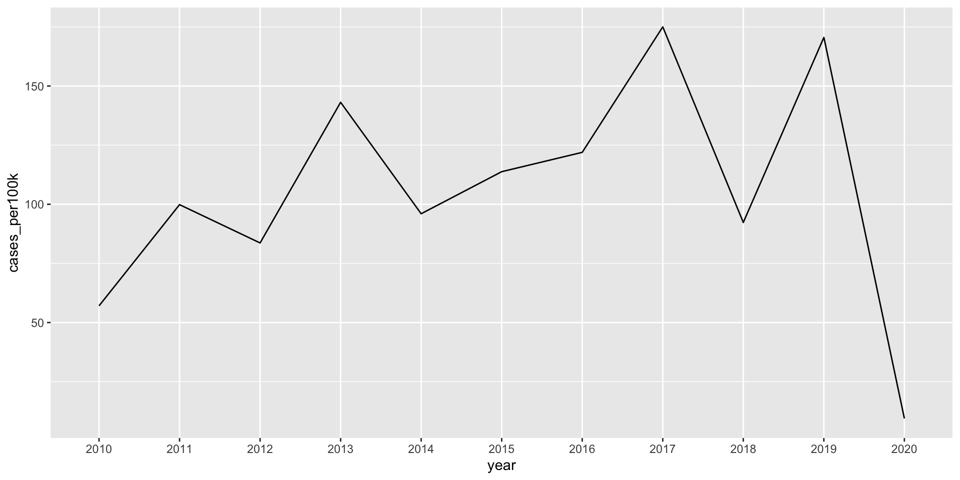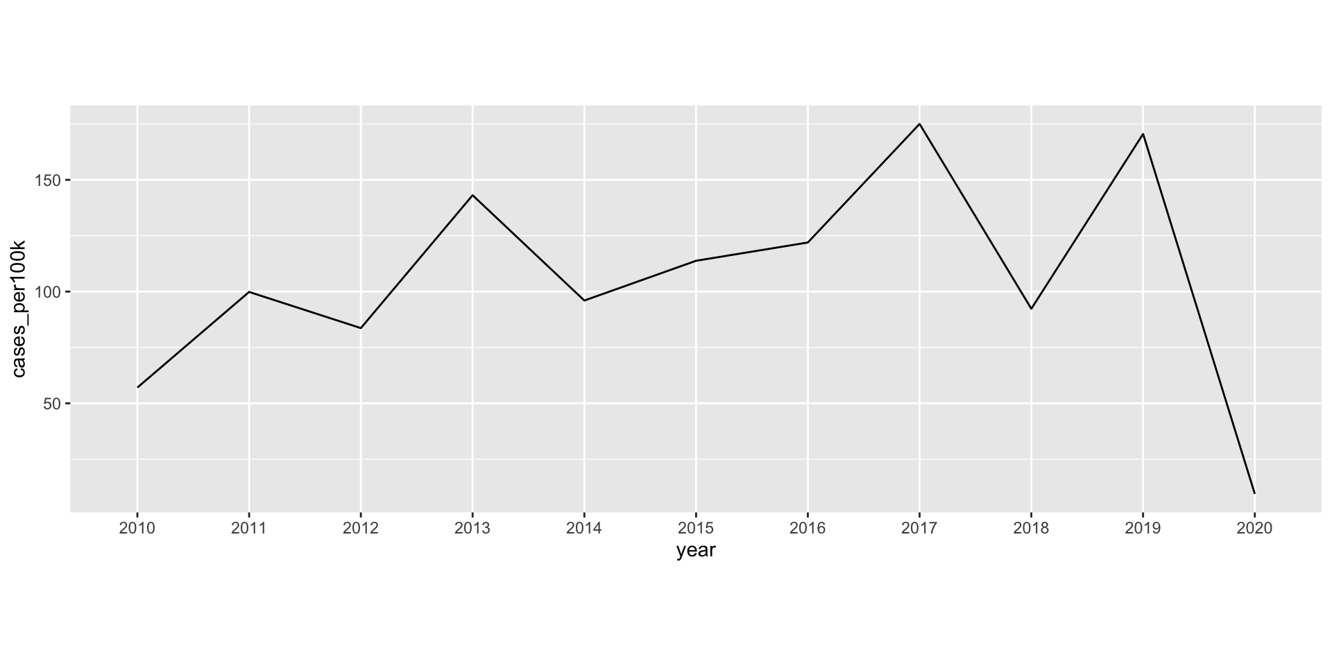 We have 10 units on our x-axis (year ranges from 2010 - 2020), and ~175 units (case_per100k ranges from 0 to ~175) on our y-axis. By default, ggplot adjusts the space between each x-axis unit so that they are wider apart than each y-axis unit, making the plot easier to read. Below, we’ve added in tick marks for each y-axis unit to better highlight this (a single tick already existed for each of our 10 x-axis units).