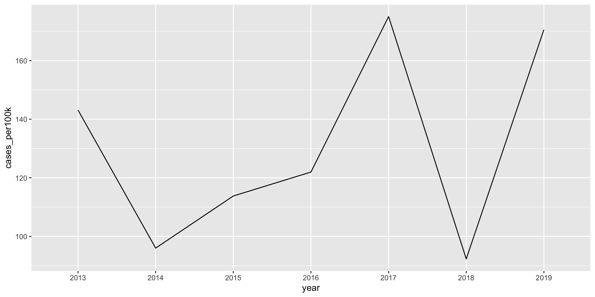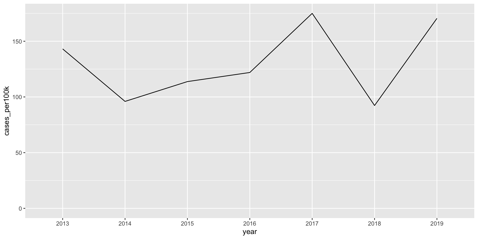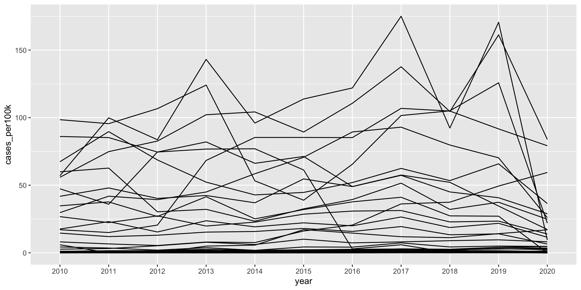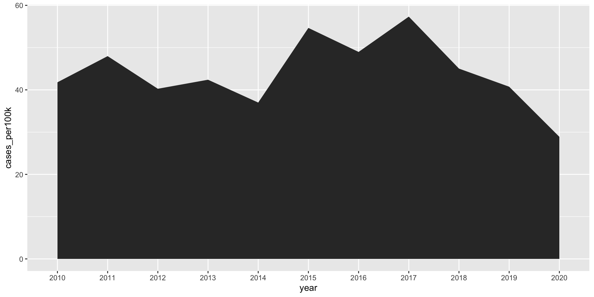 We have 10 units on our x-axis (year ranges from 2010 - 2020), and ~175 units (case_per100k ranges from 0 to ~175) on our y-axis. By default, ggplot adjusts the space between each x-axis unit so that they are wider apart than each y-axis unit, making the plot easier to read. Below, we’ve added in tick marks for each y-axis unit to better highlight this (a single tick already existed for each of our 10 x-axis units).