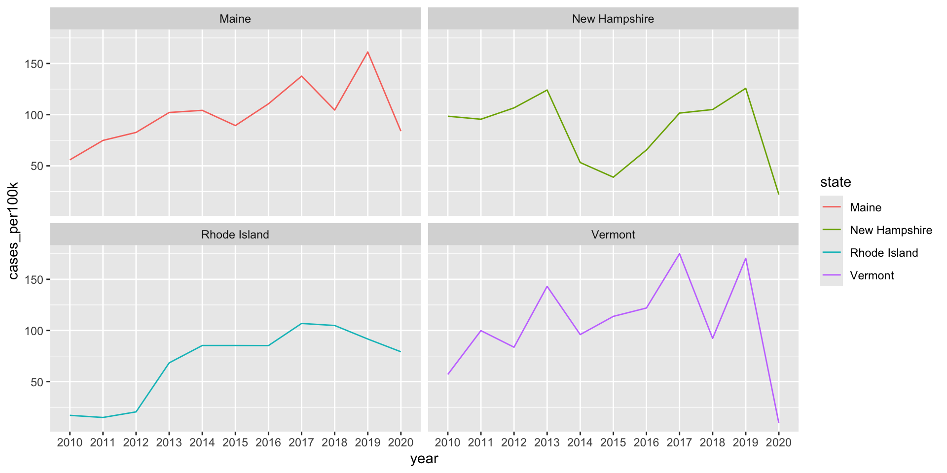 Let’s first look at Lyme disease incidence for Vermont from 2010 - 2020 without adjusting the aspect ratio: