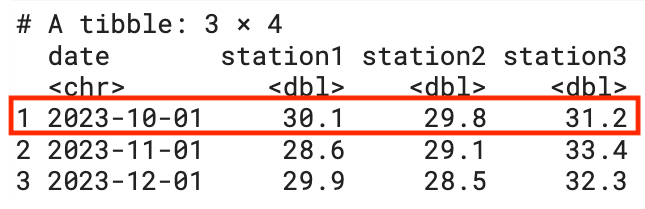Take this tibble (very similar to a data.frame) of temperature recordings at three stations on three dates: