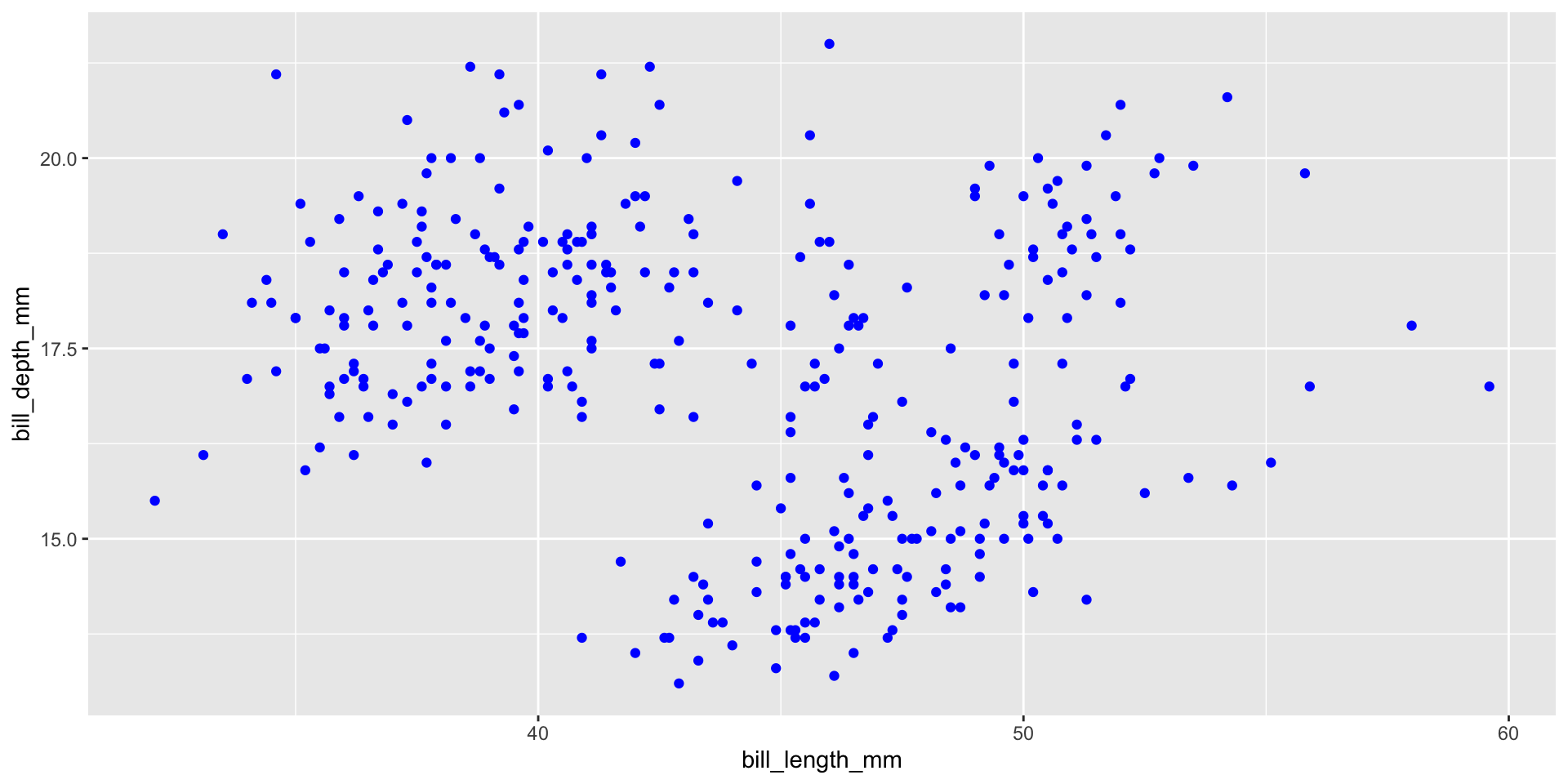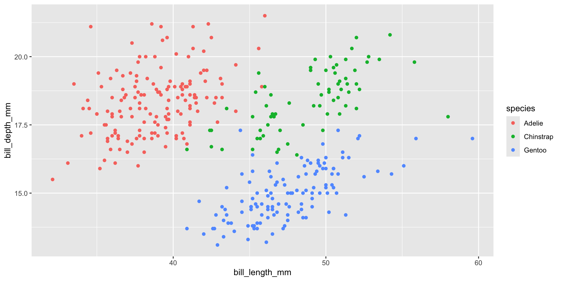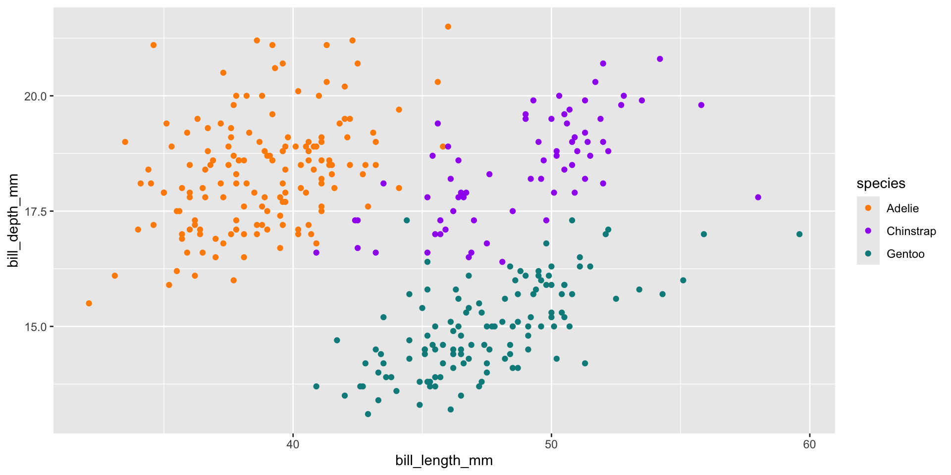 geom_point(data = penguins, mapping = aes(x = bill_length_mm, y = bill_depth_mm, color = species), alpha = 0.5) +