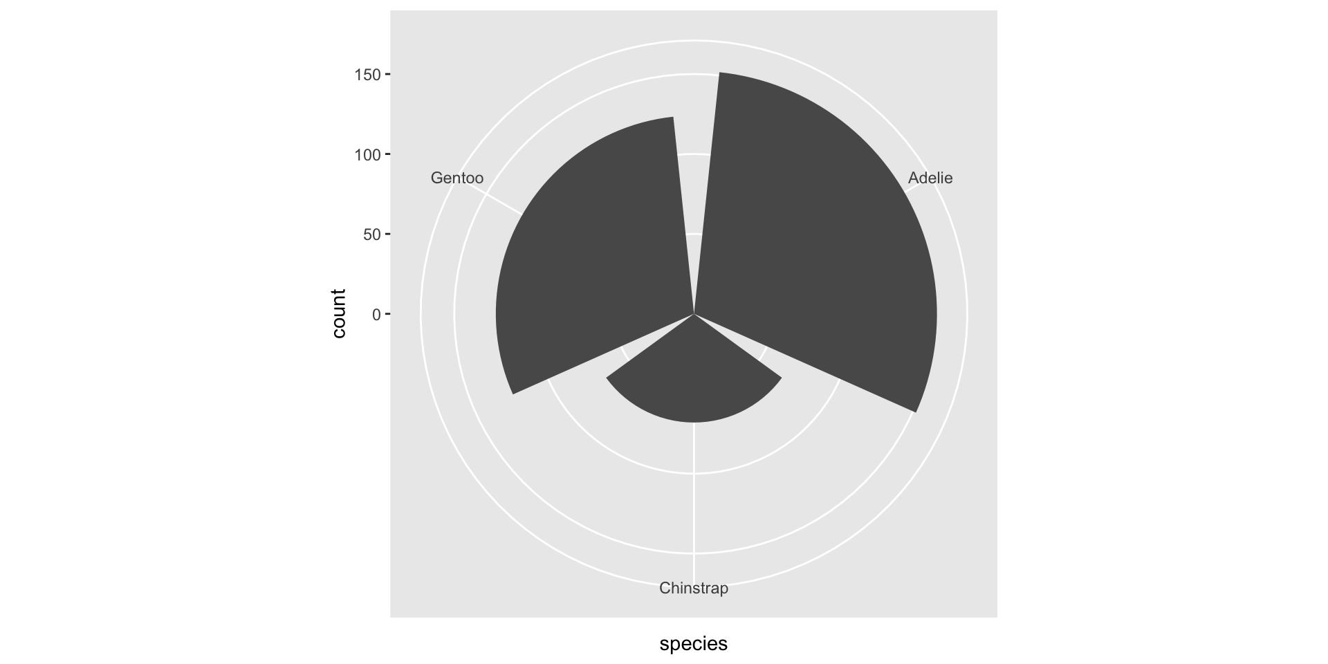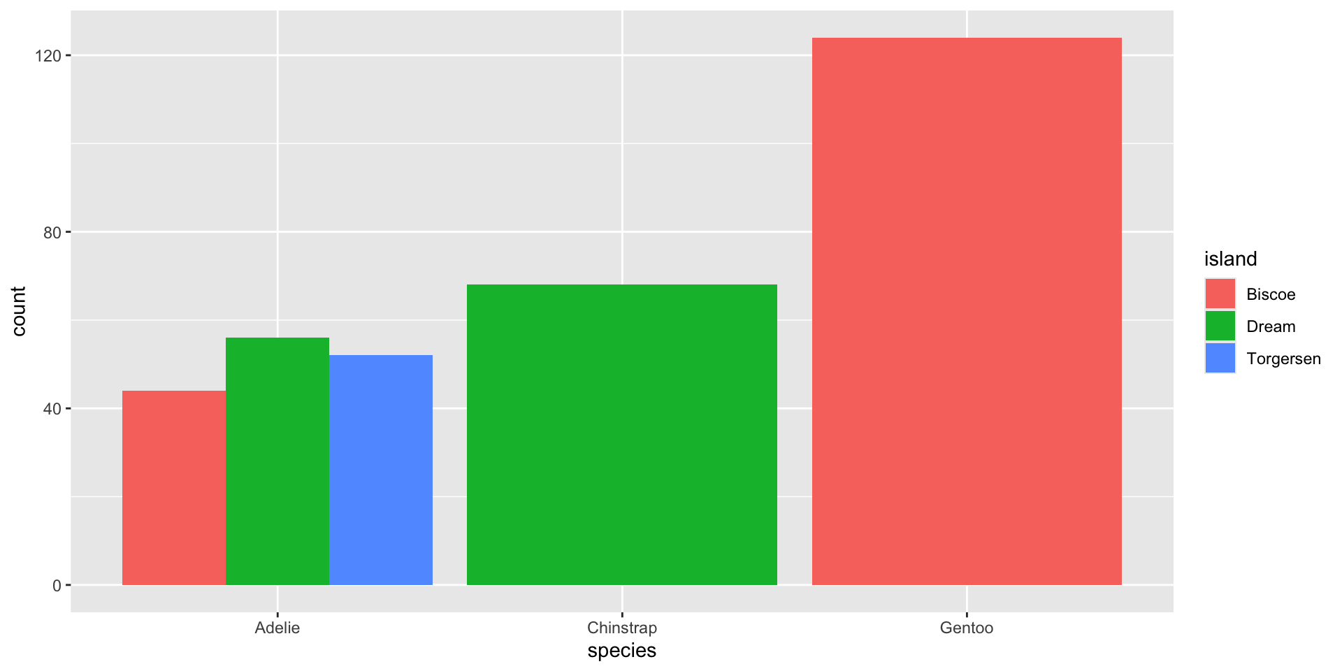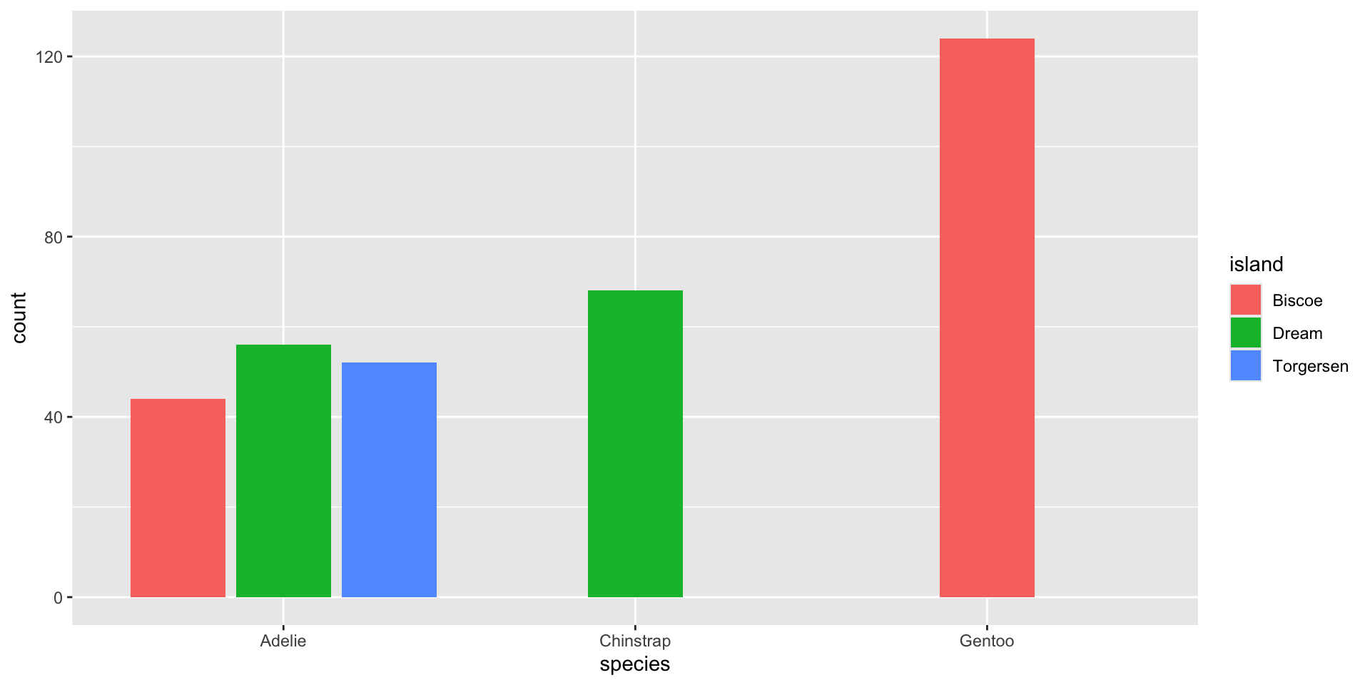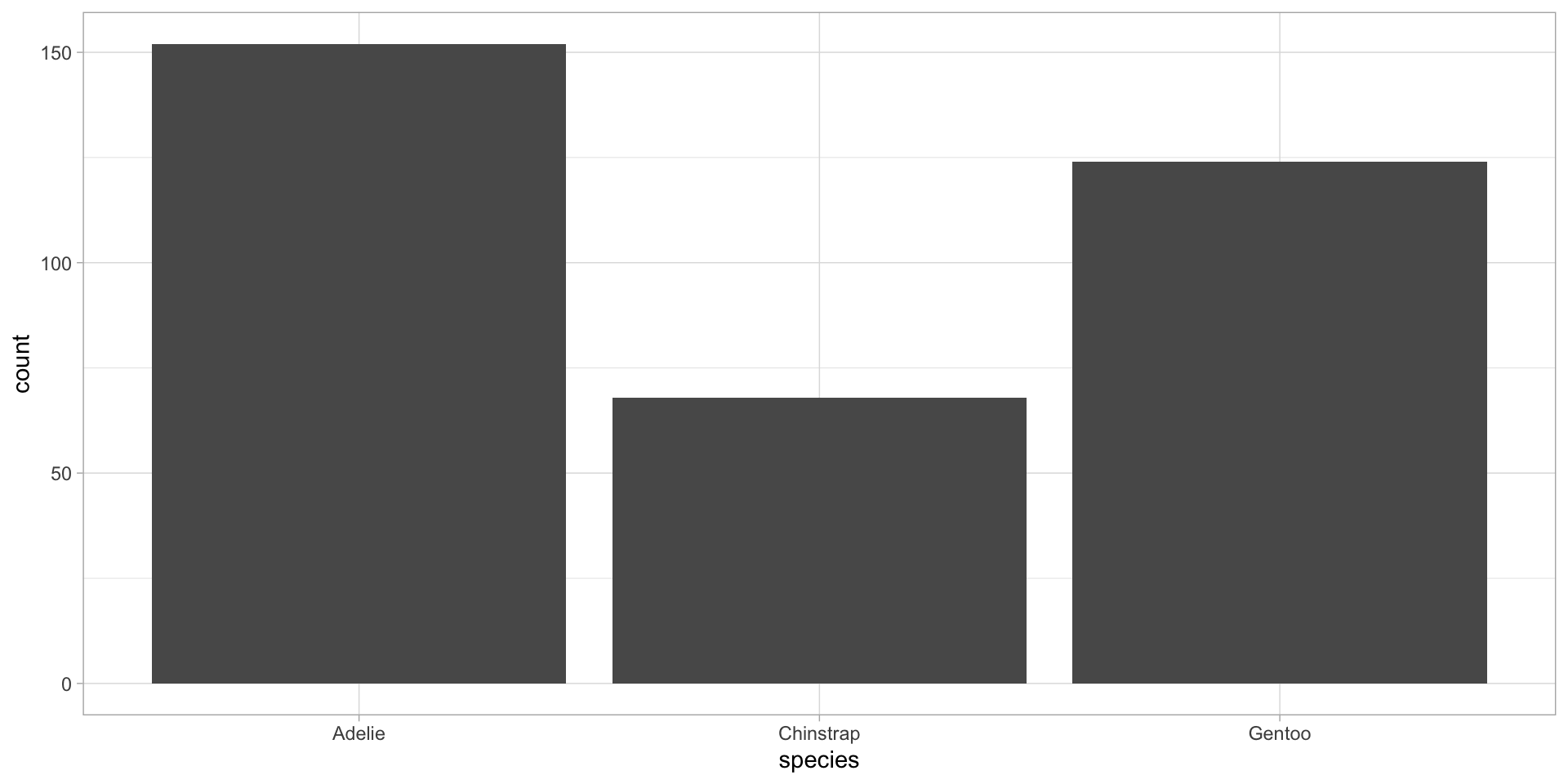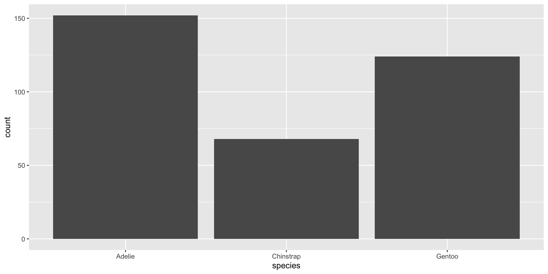 The default statistical transformation used in geom_bar() is count, which first groups our categorical variable (species), then calculates a count for each unique level (Adelie, Chinstrap, Gentoo).