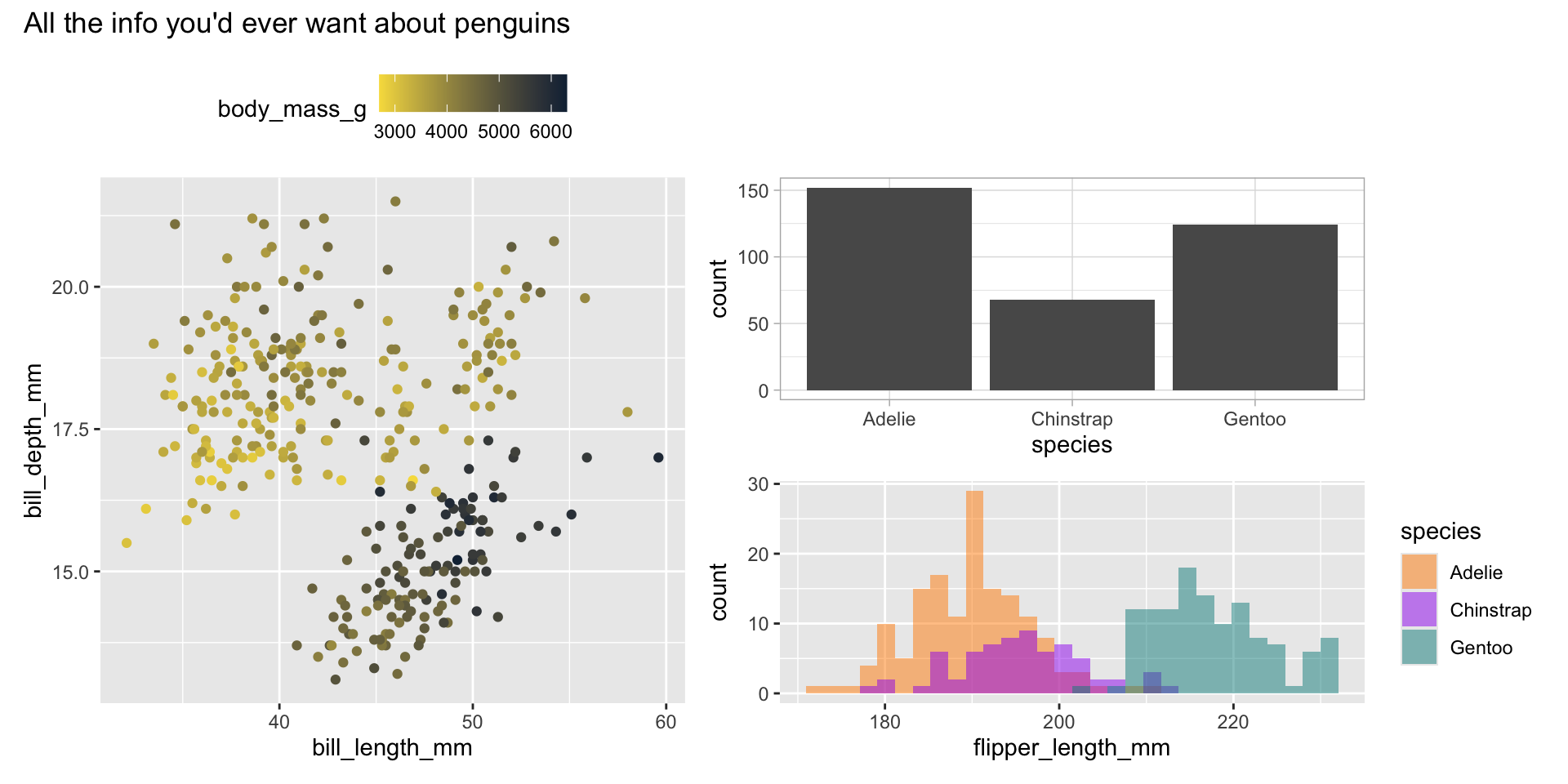 Let’s combine a few of our previous separate plots into a single graphic to round out our quick {ggplot2} review. We’ll do so using the {patchwork} package