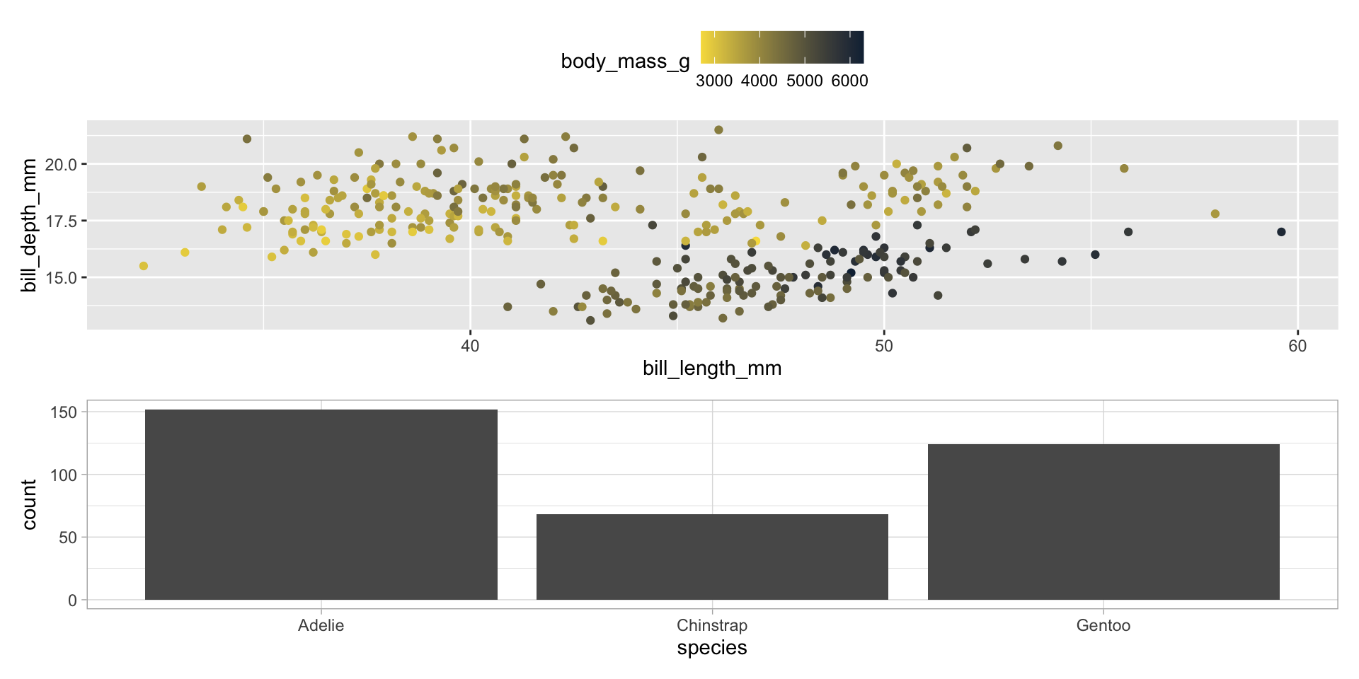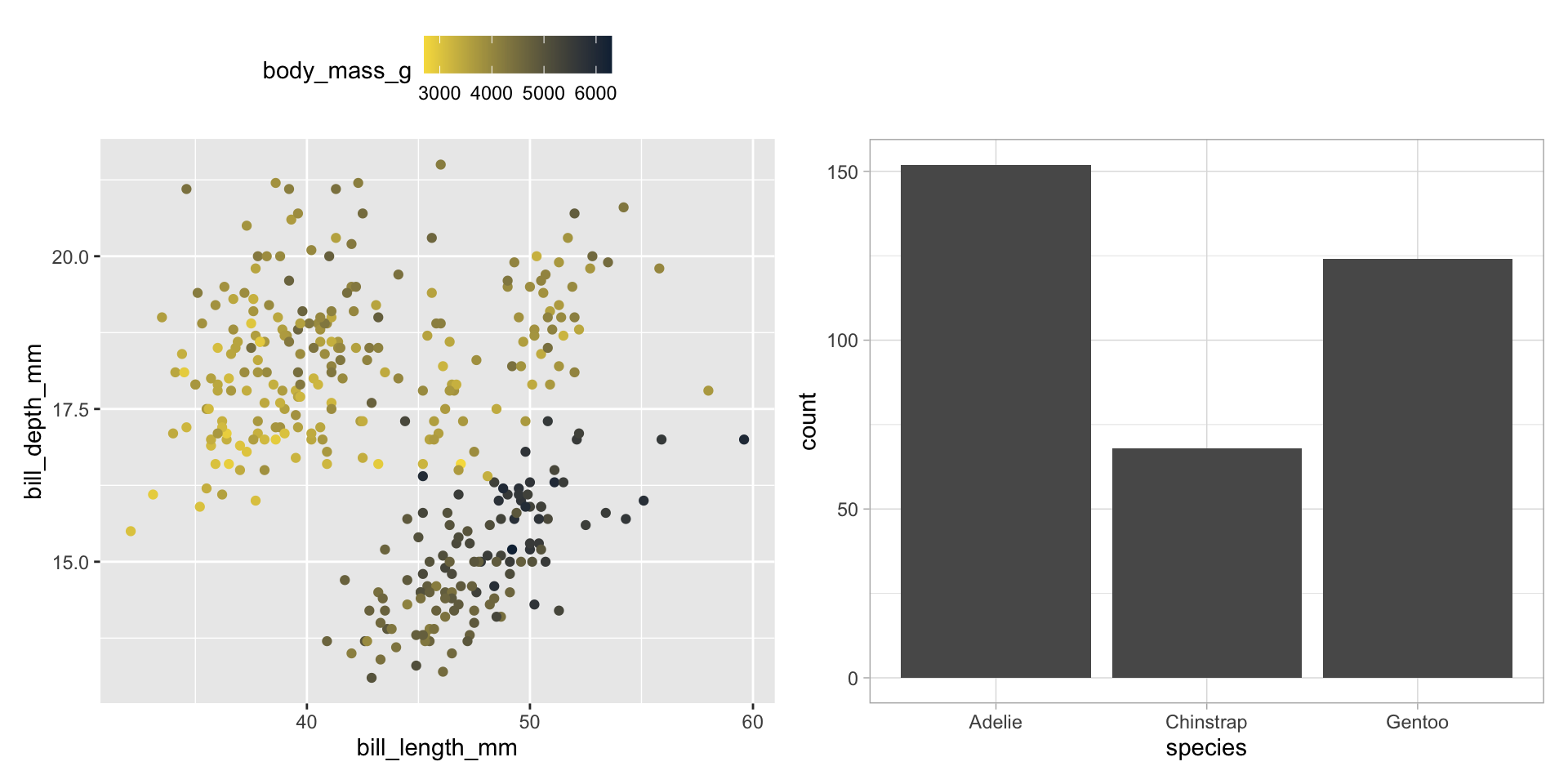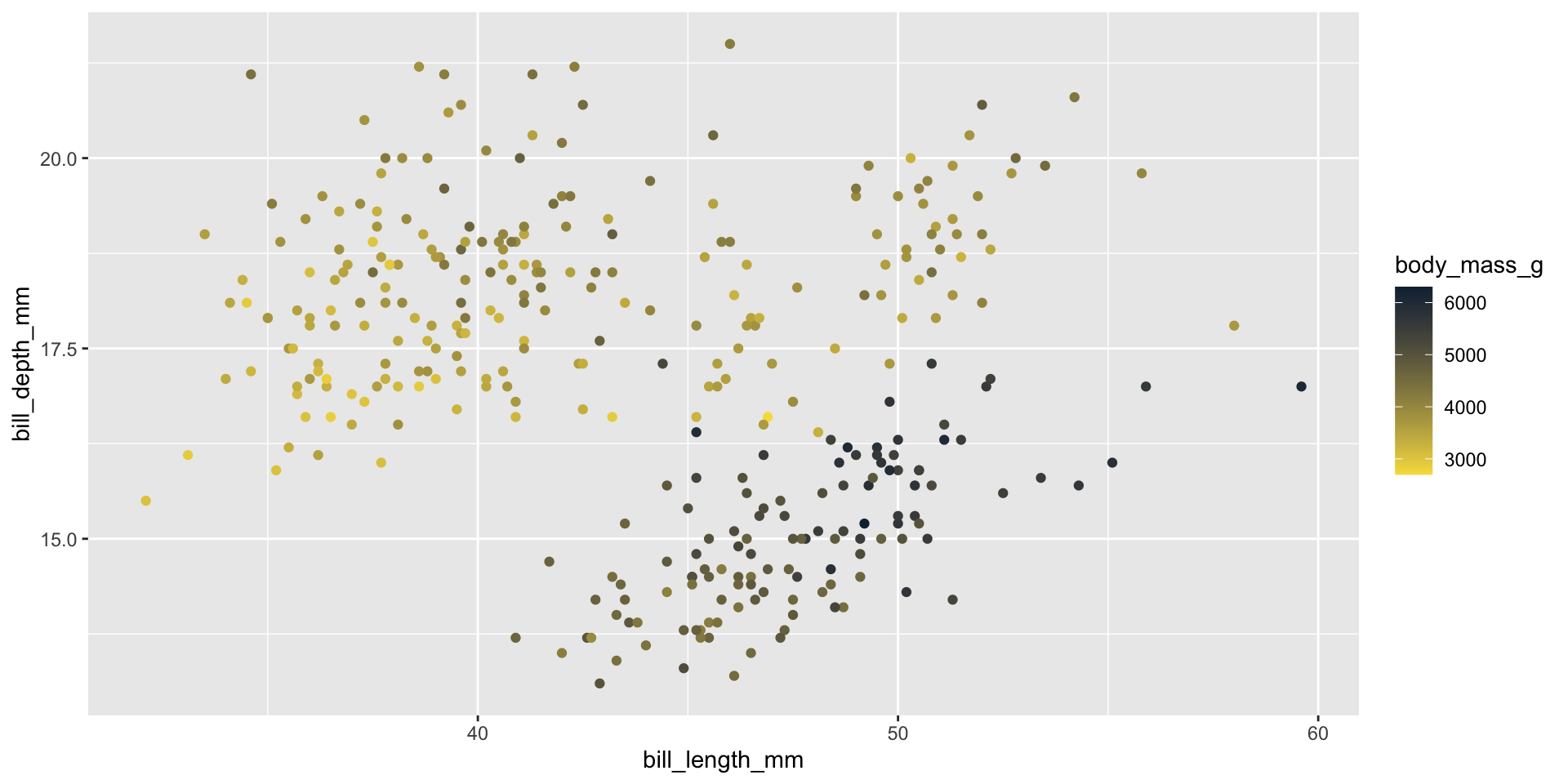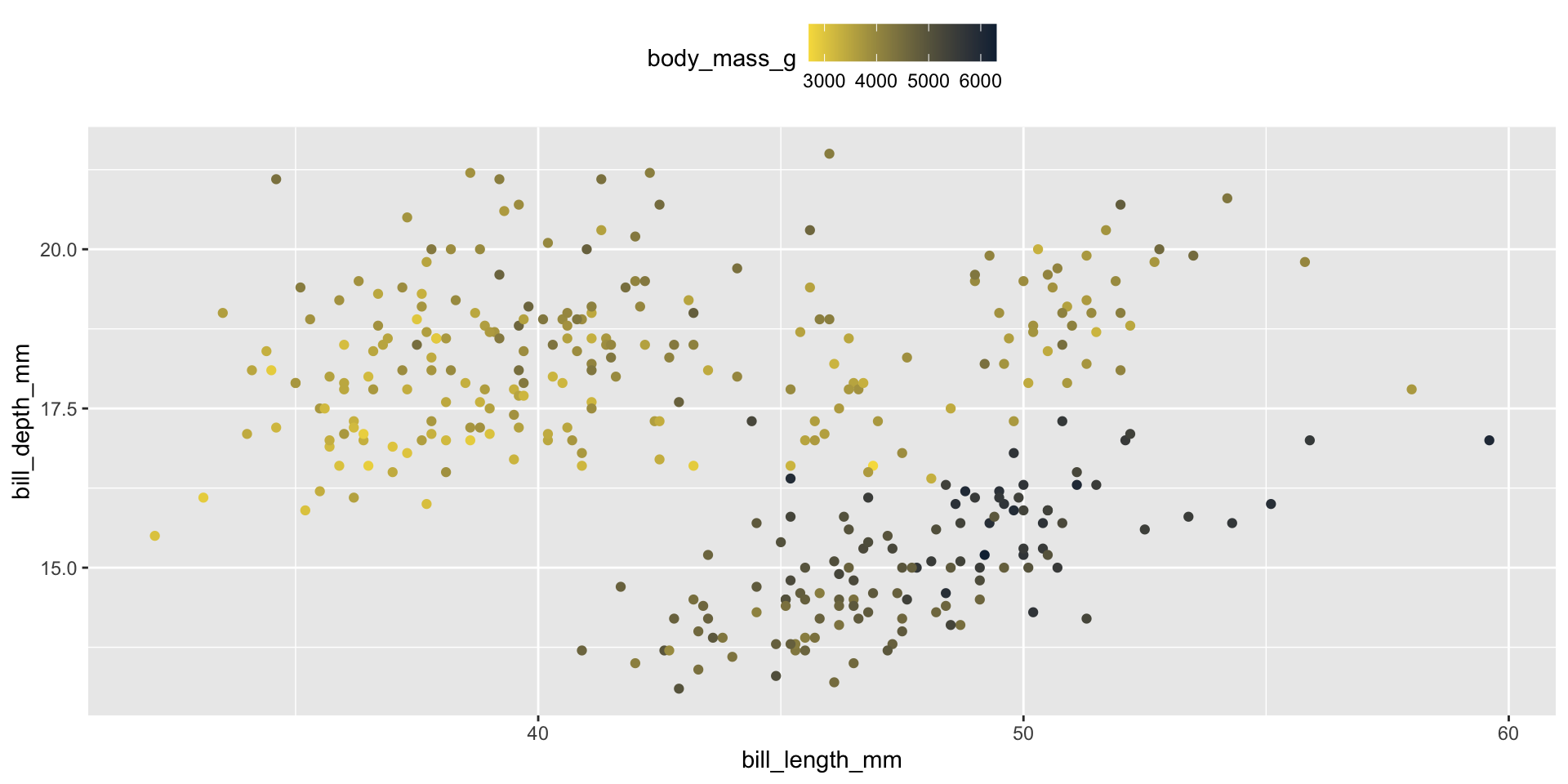 In the previous example, we mapped color to a categorical variable (species). We can also map color to continuous variables (e.g. body_mass_g):